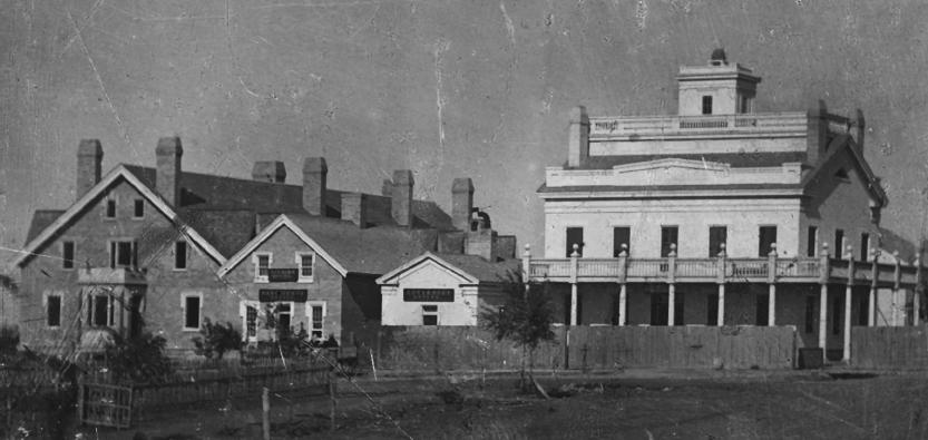 Left to right: Brigham Young’s Lion House, church president’s office, governor’s office, and Beehive House. Courtesy Church History Library.