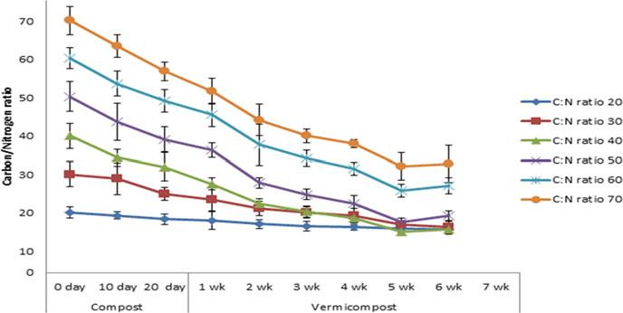 Fig.1.4 ChangesinCarbon:Nitrogenratioduringvermicompostingof flyash-cowdung-waste papermixtureatdifferent E.fetida stockingdensities.Errorbarsindicatestandarddeviation. [SourceMupambwaandMnkeni(2016)]