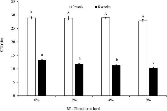 Fig.1.6 ChangesinC:Nratiofollowing8weeksofvermicompostingcowdung-papermixture amendedwithincreasinglevelsofphosphorusfromigneousrockphosphate.*Errorbarsrepresent standarddeviation.*Differentuppercaselettersindicatesignificantdifferences(P < 0.05)between treatmentsatweek0;whilstdifferentlowercaselettersindicatesignificantdifferences(P < 0.05) betweentreatmentsatweek8.[Source:Mupondi(2010)]