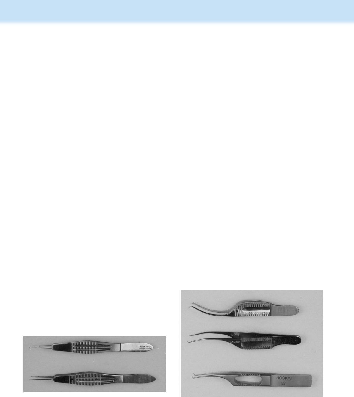 The major difference of the ophthalmic tissue forceps is their tips, which have highly specialized indications (Table 1.1). In selecting these tissue forceps, one should handle them individually and use those forceps that feel the most comfortable to the surgeon.