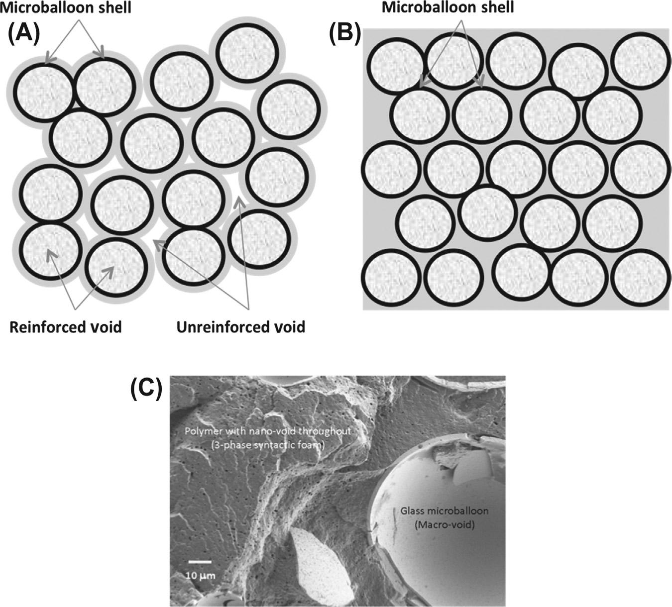 Fig.1 4 comparestwo-andthree-phasesyntactic foams.Three-phasesyntacticfoams (Fig.1 4A)aredesignedsuchthatthemicroballoonandbinderphasevolumefractionis lessthanone;theremainderbeingtheunreinforced,interstitialvoid.Two-phasesyntactic foams(Fig.1 4B)aredesignedsothatthevolumefractionsofthebinderphaseand microballoonsadduptounity,thatis,thereisenoughbindertofilltheinterstices betweenthemicroballoons.Typically,thedimensionsoftheunreinforcedvoidsinasyntacticfoamareonamicrometerscale. Fig.1 4C showsthemicrostructureofathreephasesyntacticfoam,madeofglassmicroballoonsandporouspolymerbinder.
