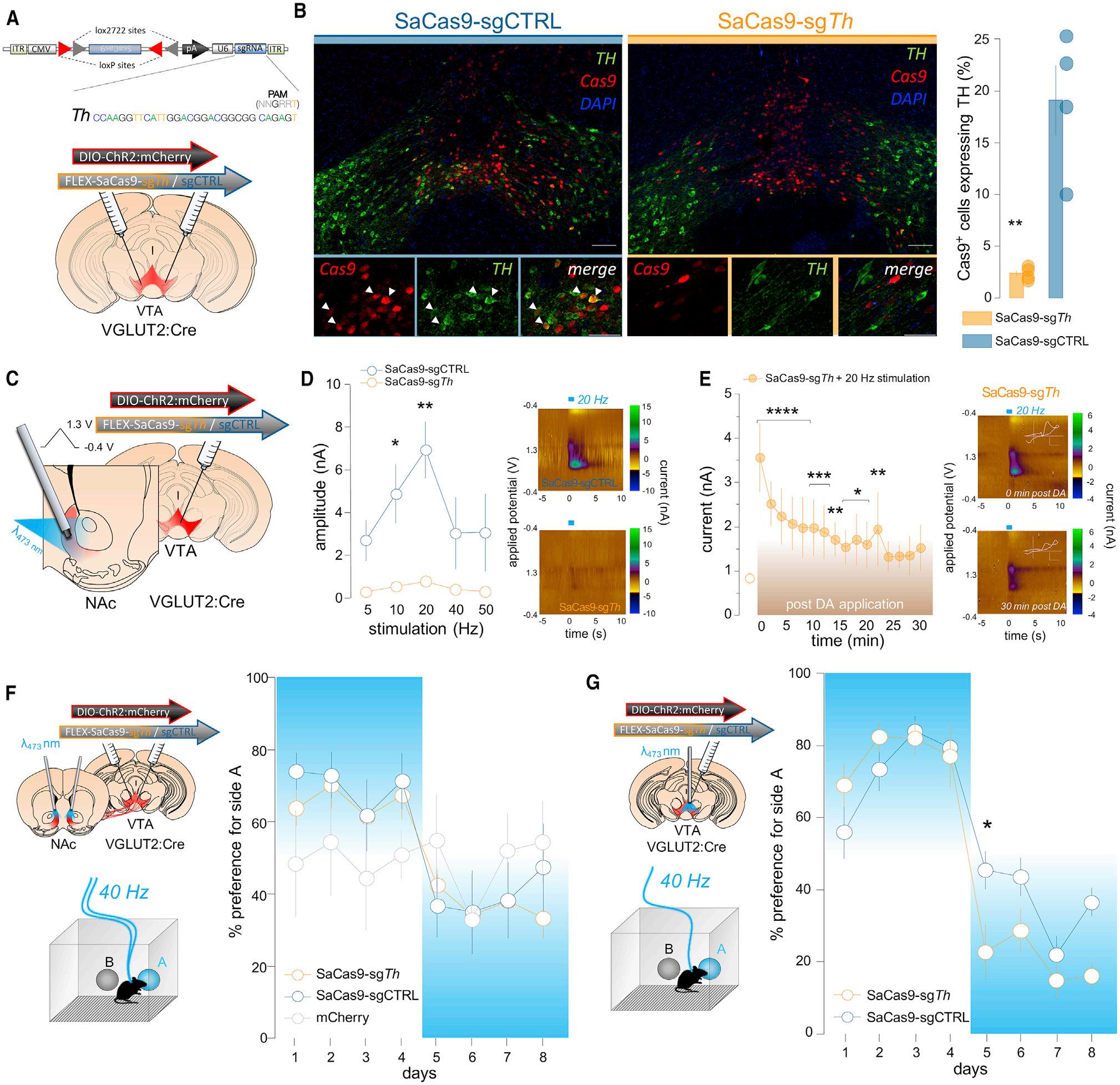 WhiletheabovedatasuggestthatVTAglutamateneuronscan conveyareinforcementsignalthatdoesnotdependon increasedDArelease,thedisruptionofDAsynthesisandrelease includedneuronsthatdonotexpressVGLUT2intheadultdueto transientdevelopmentalexpressionofVGLUT2inawiderpopulationofmidbrainDAneurons(FigureS1).Further,lossofTH fromearlydevelopmentmightcausecompensatoryadaptations incKOmice.Tobypasstheseissues,weturnedtoarecently developedviral-basedCRISPR/Cas9approachtodisruptDA synthesisandreleaseselectivelyfromadultVTAneuronsthatexpressVGLUT2.ThisapproachreliedonasingleAAVvectorfor Cre-dependentexpressionof Staphylococcusaureus Cas9 (SaCas9)andU6promoter-drivenexpressionofasingle-guide RNAtoinduceindelmutationsinthe Th gene(sgTh)(Hunker etal.,2020).ThisAAVvector(orsgCTRL)wasinfusedtogether withAAV-DIO-ChR2:mCherryintoVTAofVGLUT2:Cremice (Figure4A).Immunohistochemicalanalysisshowed19%of Cas9-expressing(VGLUT2)VTAneuronsexpressedTHinthe sgCTRLgroup,butonly2%expressedTHinthesgTh group (Figure4B).Using exvivo FSCV,wefoundsubstantiallyreduced ChR2-evokedDAreleaseinthesgTh-comparedtosgCTRL-injectedbrains,demonstratingsuccessfuldisruptionofDArelease fromVTAglutamateneurons(Figures4Cand4D).ExogenousDA applicationrescuedevokedDAtransientsfromthesgTh brains, confirmingthatVTAglutamateterminalsretainedtheabilityto recycleandreleaseDAwhensubstratewasavailable(Figure4E).