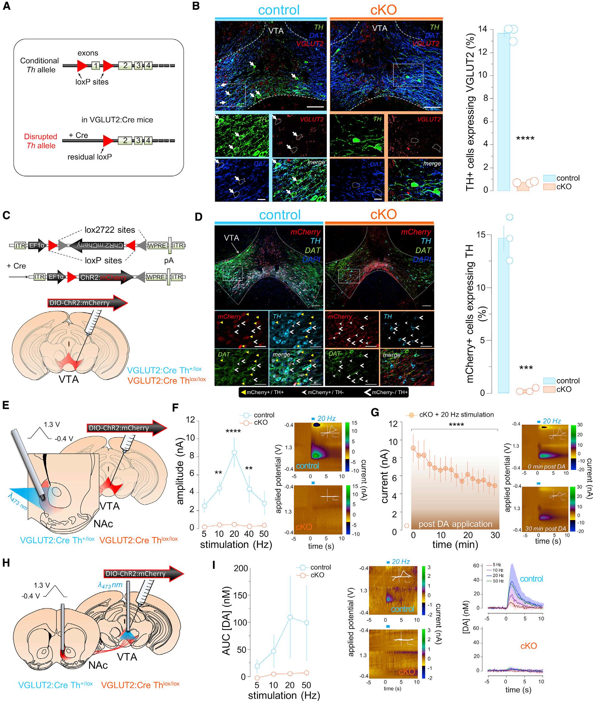 TotestthecontributionofDAco-transmissiontoVTAglutamate neuronfunction,wegeneratedmicewithconditionaldeletion of Th (DarvasandPalmiter,2010)selectivelyinVGLUT2-Creexpressingneurons(Figure1A).BrainsectionsfromcKO (Slc17a6+/Cre;Thlox/lox),andheterozygouscontrollittermates(control: Slc17a6+/cre;Th+/lox)wereusedtoconfirmthelossofTHin VTAglutamateneurons.Usingacombinationof insitu hybridizationandimmunohistochemistry,wefoundthat 14%ofneurons expressingVGLUT2mRNAwerealsoTH+ incontrolmice, whereasTH+ VGLUT2neuronswereessentiallyabsentinthe VTAofcKOmice(Figure1B).Althoughnumerousstudiesdemonstratethat10%–20%ofVTADAneuronsexpressVGLUT2inthe adult,amuchhigherproportiontransientlyexpressVGLUT2duringdevelopment(Berube-Carriereetal.,2009; Kouwenhoven etal.,2019; Mendezetal.,2008; Steinkellneretal.,2018).Asa consequence,weobserved 80%decreaseinthenumberof TH-immunoreactivecellbodiesinbothVTAandSNcofcKOs(FiguresS1AandS1B).Wealsoobservedacorrespondingdecrease inTH-immunoreactiveDAaxonterminalsintheNAc,andcaudate/ putamen(CPu)(FiguresS1CandS1D).Incontrast,DAtransporter (DAT)immunoreactivitywasunaltered,indicatingthatDAneuronal architecturewasintactincKOmice.DespitethereducedTH expression,weobservedonlyamodestreductioninbaseline locomotoractivityincKOmice,andlocomotorresponsesto L-DOPA,amphetamine,ortheD1RagonistSKF81297were similarbetweencKOandcontrolmice,suggestingintactpsychomotorfunction(FigureS2).