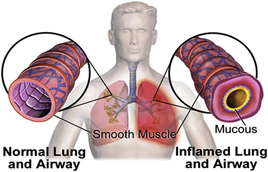 Asthmaisalungdiseaseofthebronchialairways.Inflammationand constrictionoftheairways(asdepictedgraphicallyin Fig.1.6)resultin symptoms.Patientssufferfromwheezing,shortnessofbreath,chesttightness,