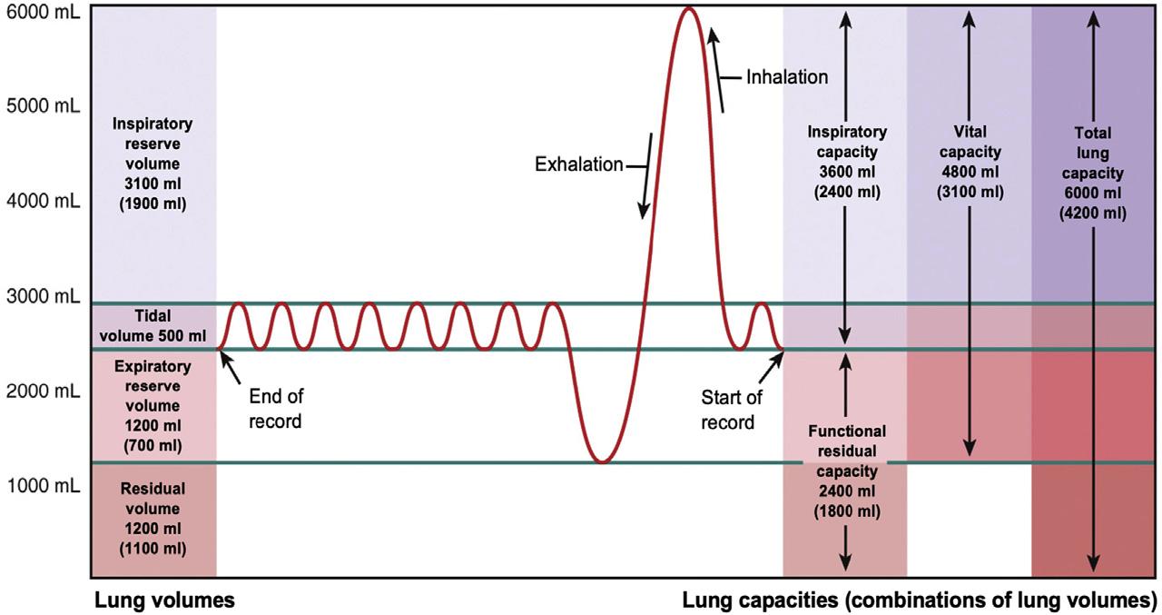 Throughthisprocessofinhalationandexhalation,theaveragehuman cycles5 10Lofairthroughthelungseachminute[2].Theamountofair takenintothelungsduringeachbreath(approximately500mLinanadult)is knownastidalvolume(VT),whilethecollectivevolumeoverthecourseofa minute(respiratoryrate VT)isknownastheminutevolume(VE).Dueto