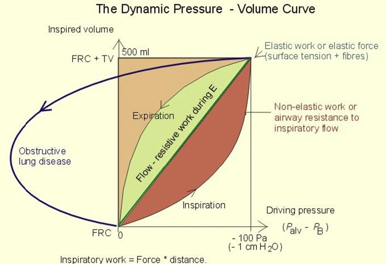 Regardingthemechanicalworkrequiredtoincreasethevolumeofthe lungsabovethelevelofFRC,itcanbedividedintotheelasticandthefriction workcomponents.Theformerreferstotheworkrequiredtodistendtheelastic tissuesofthelungandexpandthethoraciccavity.Itisstoredintheelastic bandsofthelungstoallowforapassiveexpiratorymovement.Thelatter referstotheworkrequiredtoovercometheresistanceoftheairways.Those workcomponentsareaffectedbythelungvolumeatanygivenpointoftime, assmallerlungvolumesmeanincreasedfrictionduetohighresistance, whereaslargervolumesleadtoincreasedelasticworknecessarytofurther distendthethoraciccavity.TheFRCrepresentsthevolumeinwhichtheelastic recoilforcesofthelungsareinbalancewiththeanalogousforcesofthe thoracicwall(pointofminimumworkload).Thepressurethatmustbeapplied bytheinspiratorymusclesplusthepressureappliedatthelevelofairways (orthelevelofpressureofaventilatorincasesofmechanicalventilation) equalstheVTmultipliedbythelungelastanceplustheresistanceofthe airwaysmultipliedbytheflowofairintothelungs.Therefore,thefollowing equationiscreated: