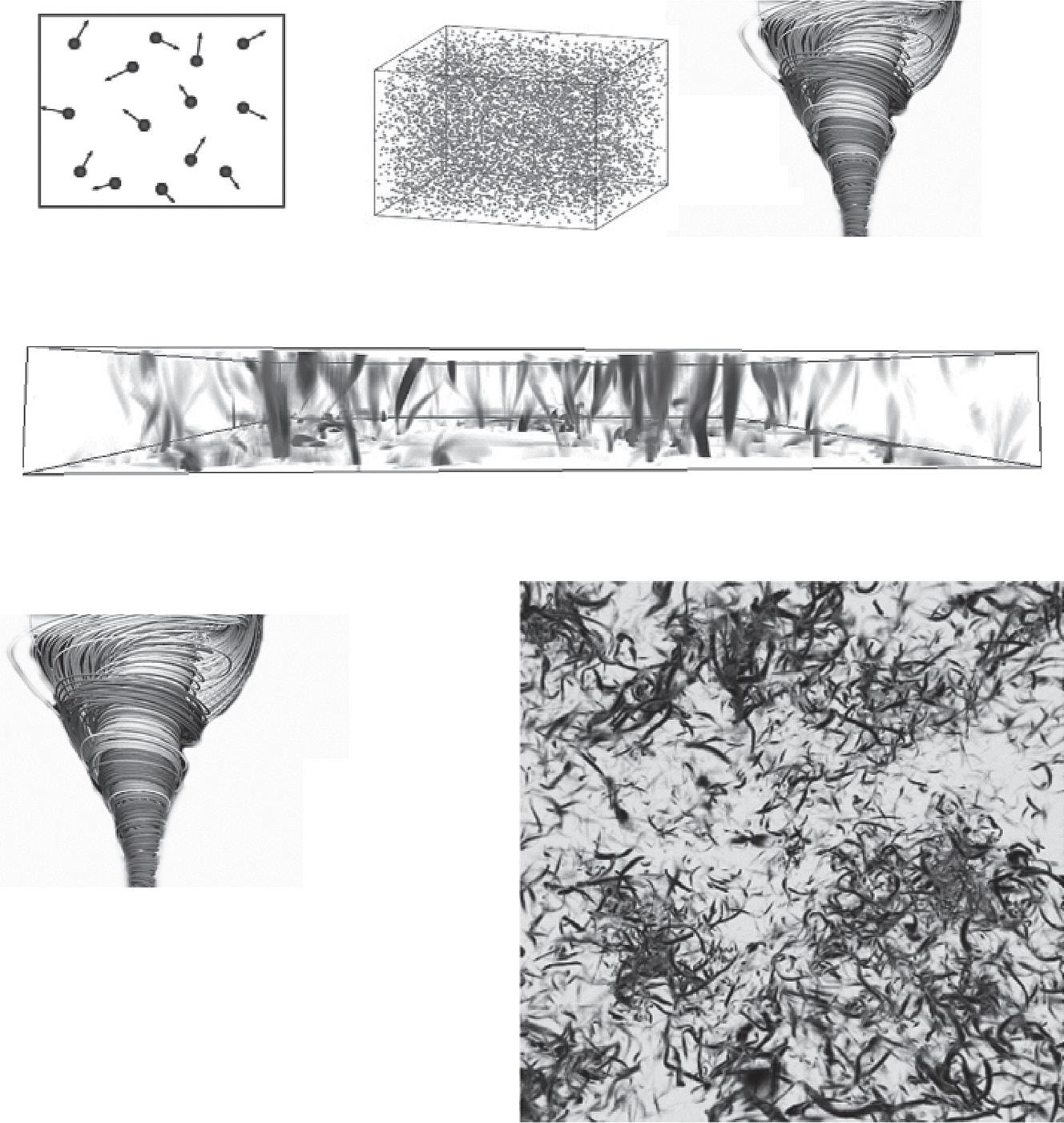 Figure 1.2 (A, left) A particle (molecule) depiction of a gas at molecular scales (nanometers). This is a classic “billiard ball”–type of description. A quantum description involves wave functions that determine the probability of finding the particles in different locations. (A, middle) At somewhat larger scales, we have hundreds of thousands of particles, and we may start to model the system using use statistical mechanics. (A, right) At macroscopic scales, perhaps tens of centimeters or larger, there are so many particles that we can average over the molecular fluctuations and use a continuum description. Here, we see a vortex.4 This level of description assumes the air is smooth, not granular (i.e., that it ignores its molecular nature). (B, top5) Many interacting vortices can still be handled computationally on the basis of continuum mechanics, but the evolution is complex and becomes difficult to understand in a simple mechanistic manner. Each elementary vortex (B, bottom left) is a bit like the molecules in (A, left). (B, bottom right) In this image, we are nearing the strong turbulence limit relevant in the atmosphere. Although this is still a supercomputer simulation, we can already see the problem of huge numbers of interacting vortices. As a result of the seemingly random collection of long, thin vortices, this turbulent view is sometimes called the “spaghetti” picture. This is a direct numerical simulation6 that models the smallest relevant scales explicitly. Numerical models of the atmosphere in general are only approximations; their smallest scales may be 10 km across. Implicitly, they average over large numbers of structures.
