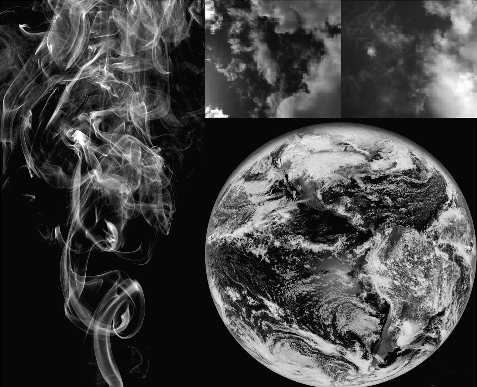 Figure 1.1 (Left) Cigarette smoke showing wisps and filaments smaller than a millimeter up to about a meter in overall size. (Upper middle and right) Two cloud photographs taken from the roof of the McGill University physics building. Each cloud is several kilometers across, with resolutions of a meter or so.2 (Lower right) The global scale arrangement of clouds taken from an infrared satellite image of Earth, with a resolution of several kilometers.b Taken together, the three images of the clouds and Earth span a range of a factor of nearly a billion in spatial scale.