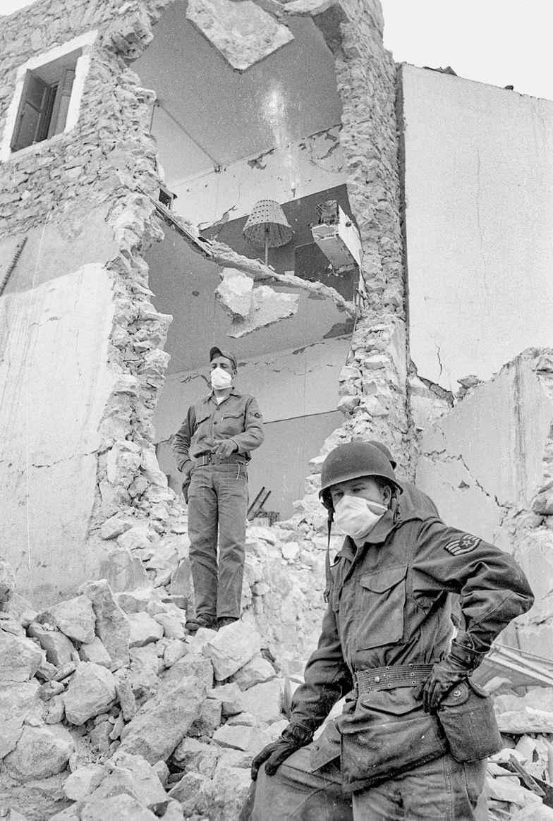 American soldiers standing in the ruins of a house in Agadir, Morocco, following the 1960 earthquake