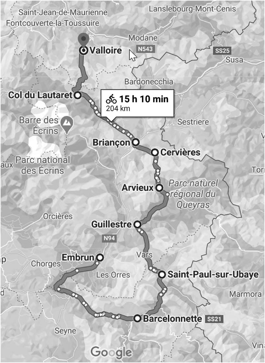 The map of the stage course (Figure 3.1) shows the cities and some of the mountains crossed by the cyclists. (Note that Google estimates that this ride would take 15 hours and 10 minutes!) We can make a list of the towns that the cyclists visited on their way from Embrun to Valloire, an itinerary for this stage (Table 3.1). This is analogous to the “reaction mechanism,” the stepby-step accounting for how the cyclists made their way through this part of France.