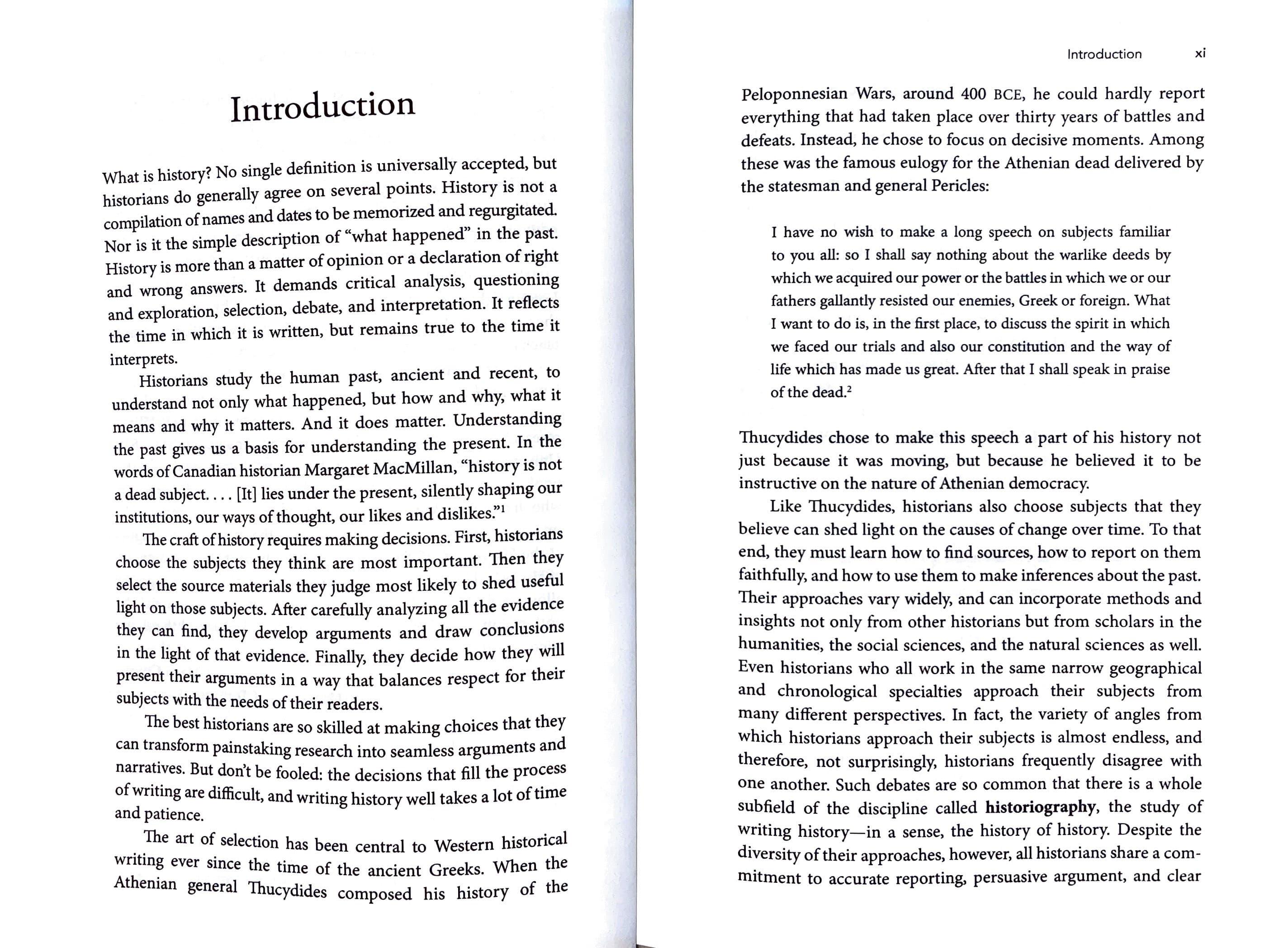 Historians study the human past, ancient and recent, to understand not only what happened, but how and why, what it means and why it matters. And it does matter. Understanding the past gives us a basis for understanding the present. In the words of Canadian historian Margaret MacMillan, "history is not a dead subject. . .. [It] lies under the present, silently shaping our institutions, our ways of thought, our likes and dislikes:''