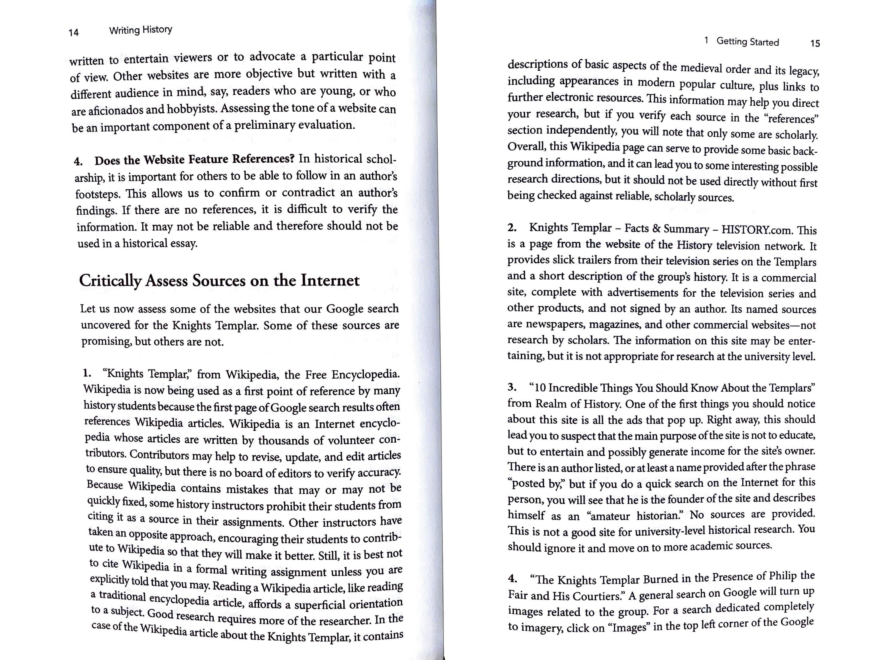 1. "Knights Templar;' from Wikipedia, the Free Encyclopedia. Wikipedia is now being used as a first point of reference by many history students because the first page of Google search results often references Wikipedia articles. Wikipedia is an Internet encyclopedia whose articles are written by thousands of volunteer contributors. Contributors may help to revise, update, and edit articles to ensure quality, but there is no board of editors to verify accuracy. Be~ause Wikipedia contains mistakes that may or may not be quickly fixed, some history instructors prohibit their students from citing it as a sour · th · ·