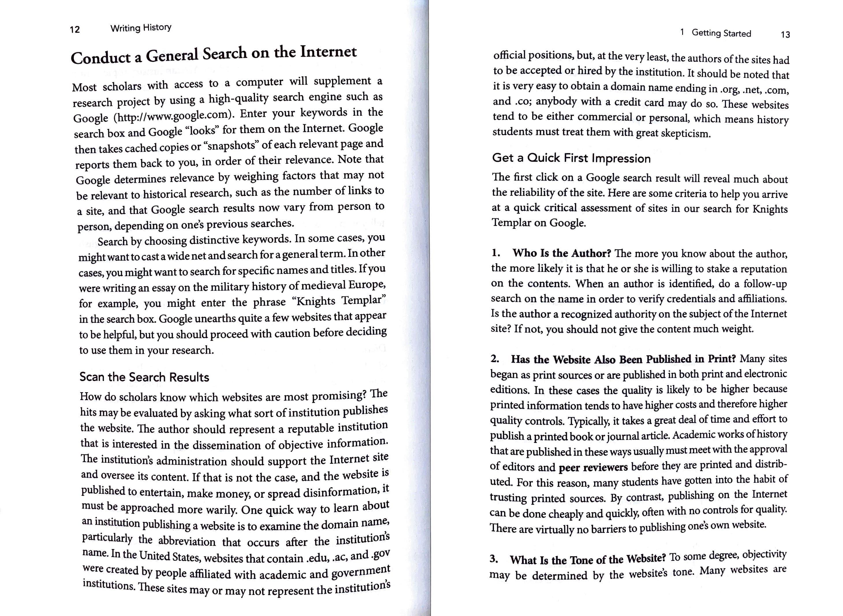 Search by choosing distinctive keywords. In some cases, you might want to cast a wide net and search for a general term. In other cases, you might want to search for specific names and titles. Ifyou were writing an essay on the military history of medieval Europe, for example, you might enter the phrase "Knights Templar" in the search box. Google unearths quite a few websites that appear to be helpful, but you should proceed with caution before deciding to use them in your research.