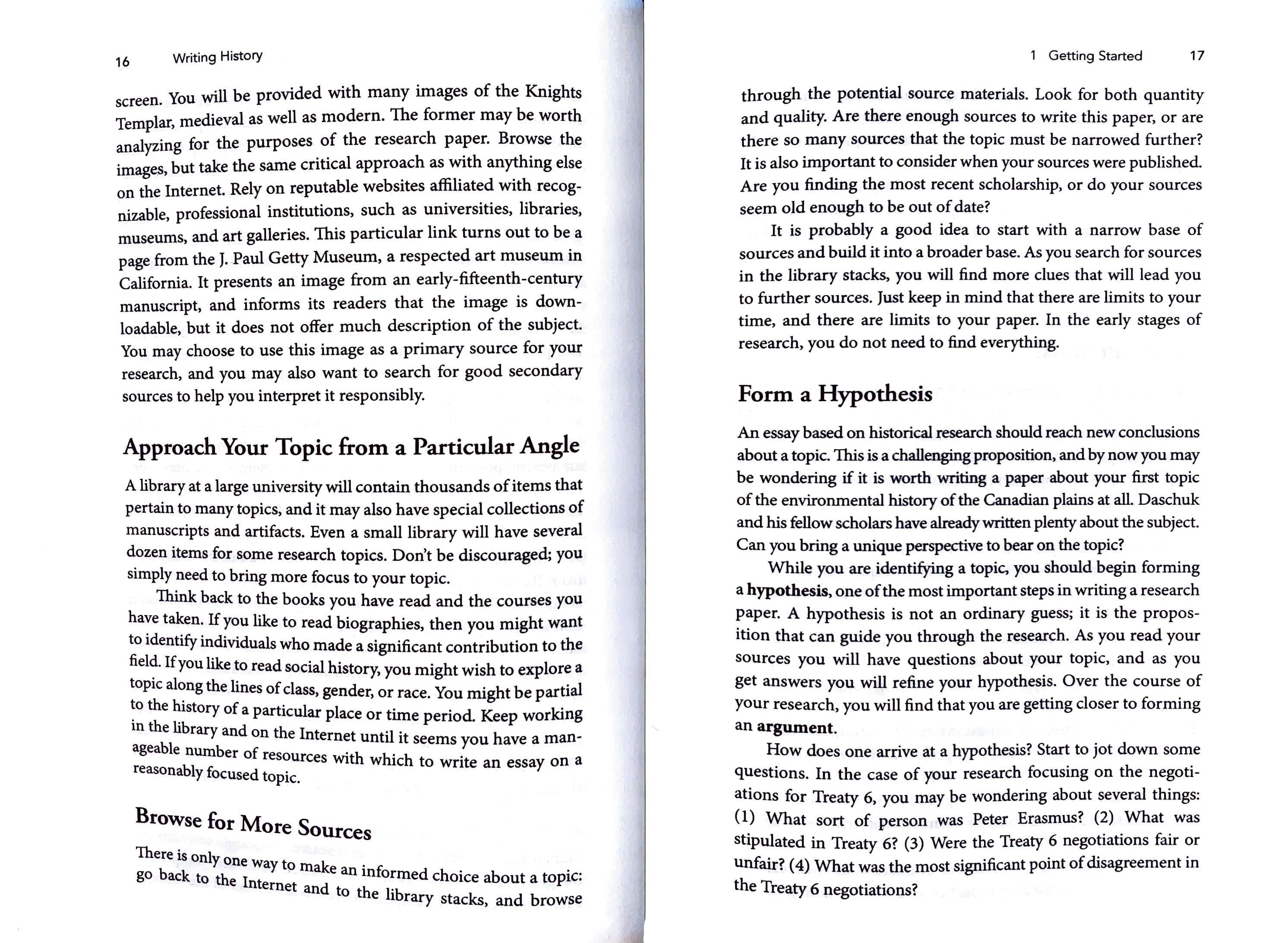 How does one arrive at a hypothesis? Start to jot down some questions. In the case of your research focusing on the negotiations for Treaty 6, you may be wondering about several things: (1) What sort of person was Peter Erasmus? (2) What was stipulated in Treaty 6? (3) Were the Treaty 6 negotiations fair or unfair? (4) What was the most significant point of disagreement in the Treaty 6 negotiations?