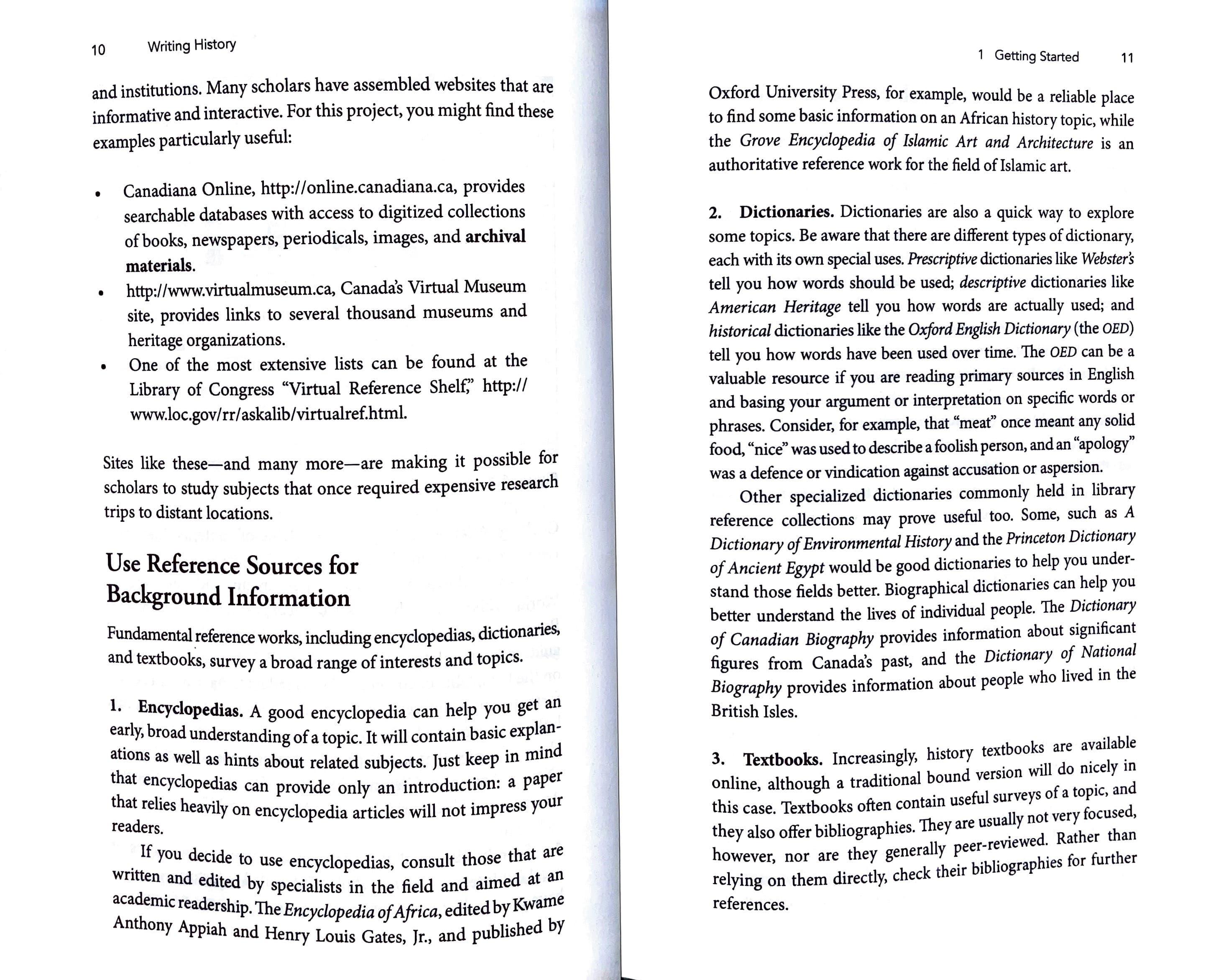 2.Dictionaries. Dictionaries are also a quick way to explore some topics. Be aware that there are different types of dictionary, each with its own special uses. Prescriptive dictionaries like Websters tell you how words should be used; descriptive dictionaries like American Heritage tell you how words are actually used; and historical dictionaries like the Oxford English Dictionary (the OED) tell you how words have been used over time. 1he OED can be a valuable resource if you are reading primary sources in English and basing your argument or interpretation on specific words or phrases. Consider, for example, that "meat" once meant any solid food, "nice" was used to describe a foolish person, and an "apology" was a defence or vindication against accusation or aspersion. Other specialized dictionaries commonly held in library reference collections may prove useful too. Some, such as A Dictionary of Environmental History and the Princeton Dictionary of Ancient Egypt would be good dictionaries to help you understand those fields better. Biographical dictionaries can help you better understand the lives of individual people. The Dictionary of Canadian Biography provides information about signi~cant figures from Canada's past, and the Dictionary of National Biography provides information about people who lived in the British Isles.
