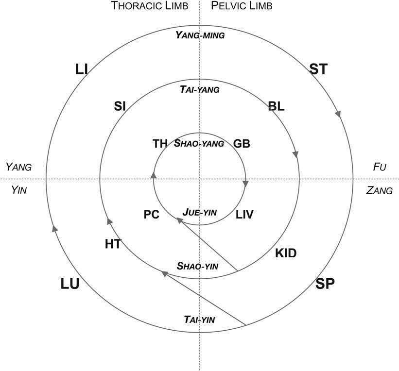 The 12 regular channels join with one another in a fixed order (figs. 1.3 and 1.4 and table 1.5). Along this course there is an endless, cyclical flow of Qi and blood within the channels. The flow always passes from one channel to the next in a specific order throughout the day; however, the Qi dominates within certain meridians at designated times. This is the traditional Chinese veterinary medicine (TCVM) circadian rhythm, which provides the body with its own internal clock. Disorders of this rhythm can be used to assist with pattern identification and TCVM diagnosis.