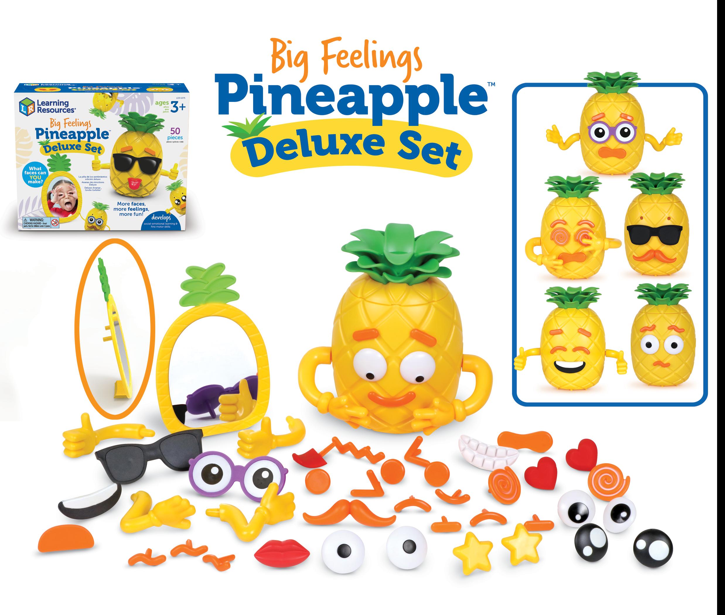 pineapple has even bigger feelings than before! The follow-up to our TOTY-nominated bestseller Big Feelings Pineapple, this set comes with more emotions and bigger pieces to help kids learn to identify and talk about emotions. Includes 41 face pieces, 3 sets of arms, pineapple mirror to practice faces, expanded feelings poster, and more. Assembled pineapple measures 4”L x 3.25”W x 6.25”H.