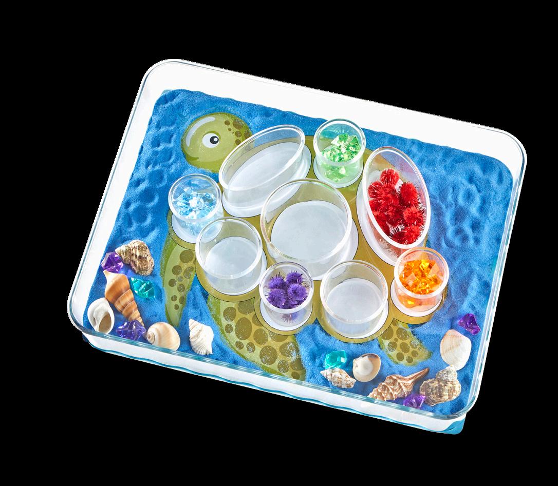 Learn a rainbow of new color and sorting skills with the help of this vibrant activity tray! Grab the specially designed fine motor tongs, then sort and match the set’s 30 counters by 5 shapes (sun, star, cloud, moon, lightning bolt) or 6 colors (red, orange, yellow, green, blue, purple). Includes 5 double-sided cards featuring patterning and addition. All components store in the cloud spaces, including counters, tongs, and cards. Assembled tray measures 12.25”L x 7.5”H, and comes with slots for all six colors.