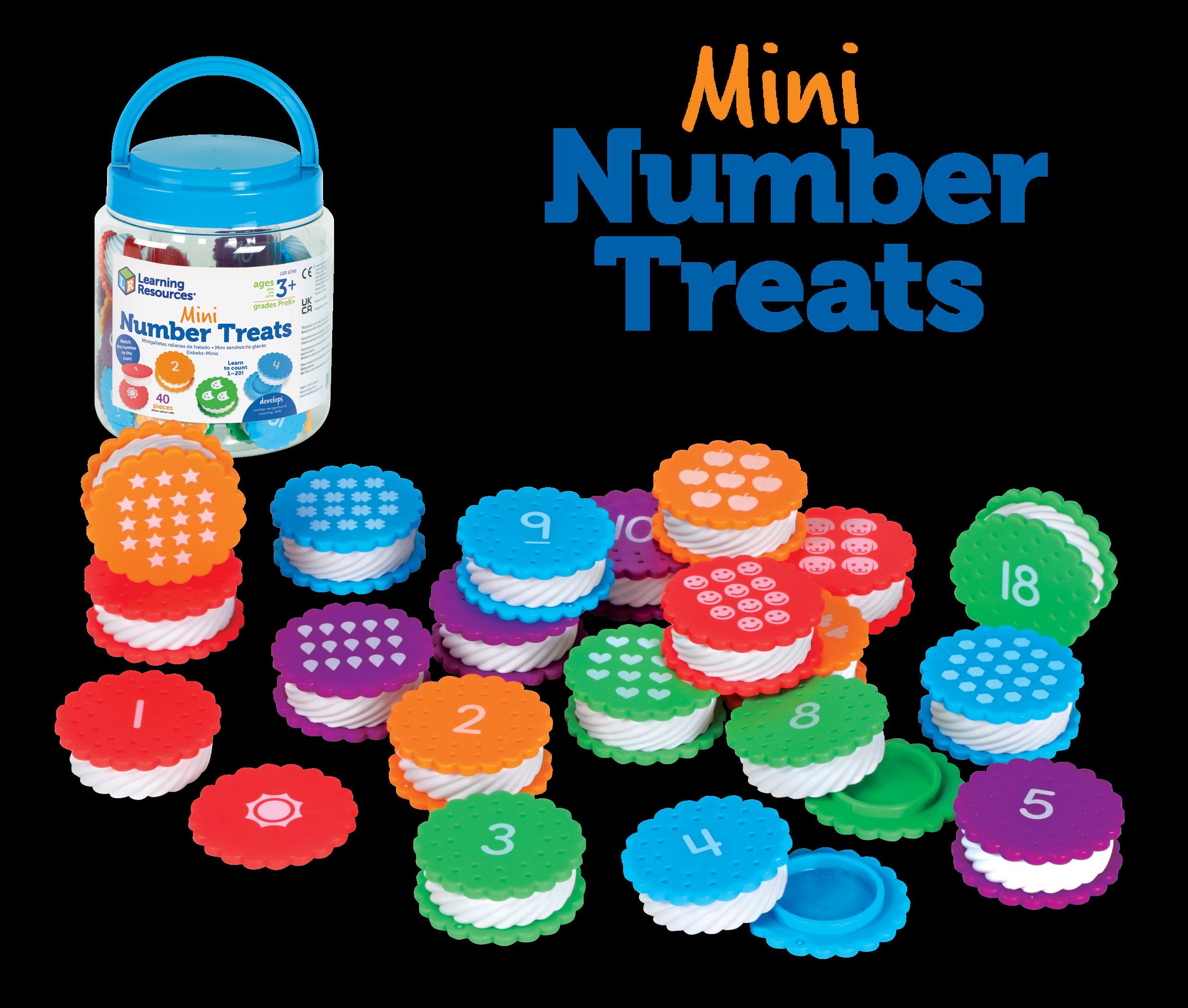 •••••••••••••••••• • ••••••••••••••••• • All products, titles, descriptions, SRPs, availability and images are subject to change and are for reference purposes only Please check with Learning Resources for final product information. Confidential and Proprietary. © Learning Resources, Inc. Learning is where we play Early Childhood Ages 3+ This set of 20 cookies makes it easy to count to 20—one side features the numeral, and the other features a picture of the corresponding amount of dolphins, beach balls, and more! Assembled cookies measure 1.75”H x 1.75”W. Product Name: Mini Number Treats Part Number: 6798 Piece Count: 40 Approx. Availability: Spring 2023 Approx. SRP: $21.99 UPC: 765023.06798.9 Case Pack Quantity: 6 Package Dimensions: 8.5”H x 6.5”W Package Type: Bucket Country of Origin: China Skill Sets • Fine Motor • Counting • Number Identification • Color Identification