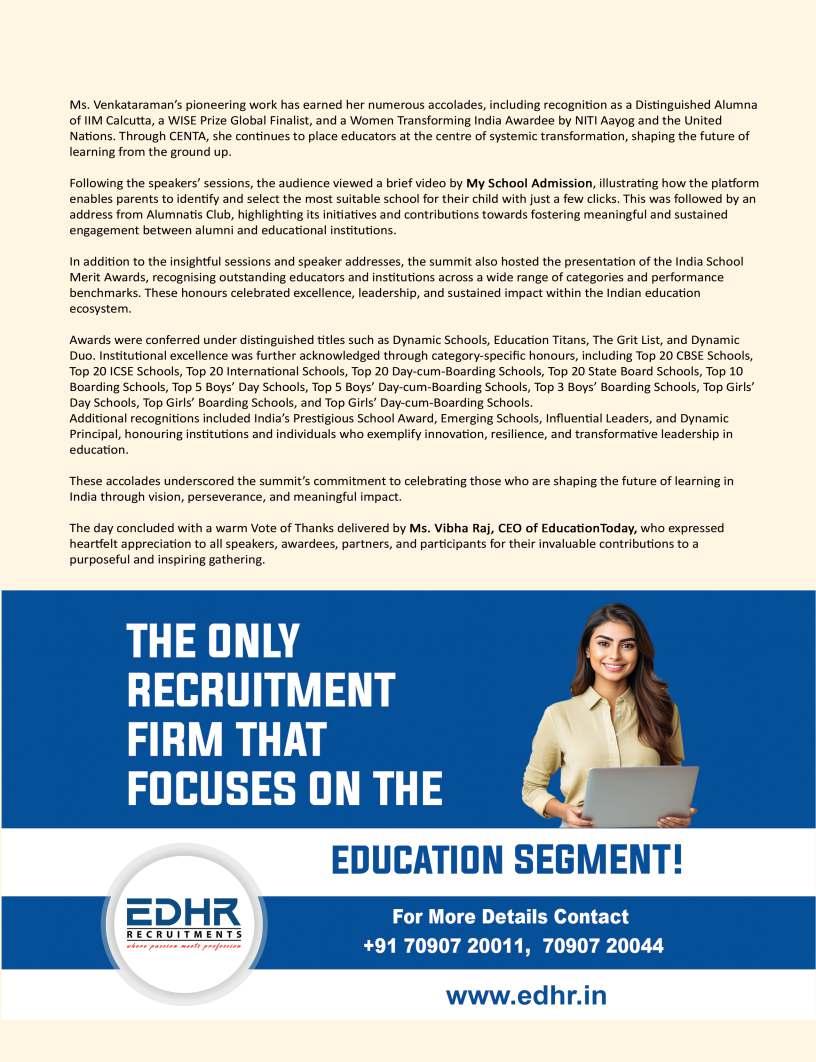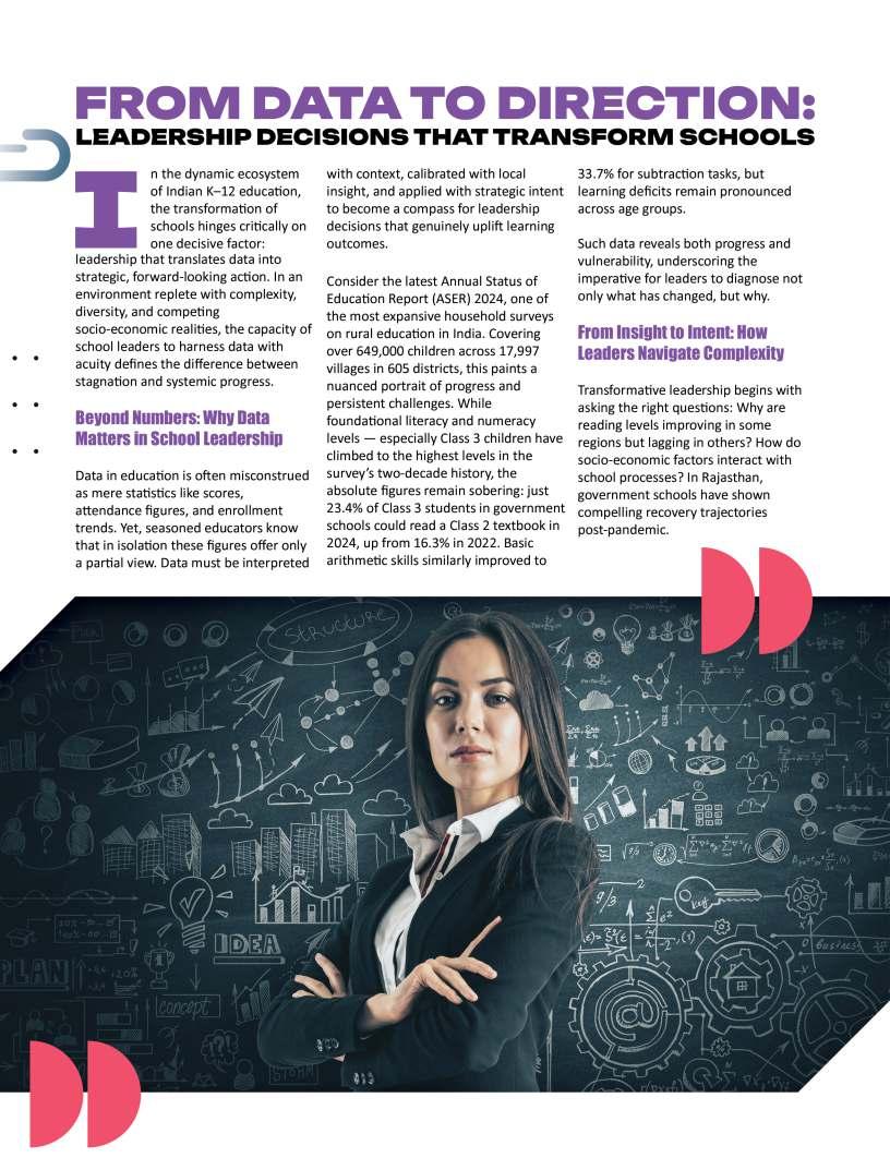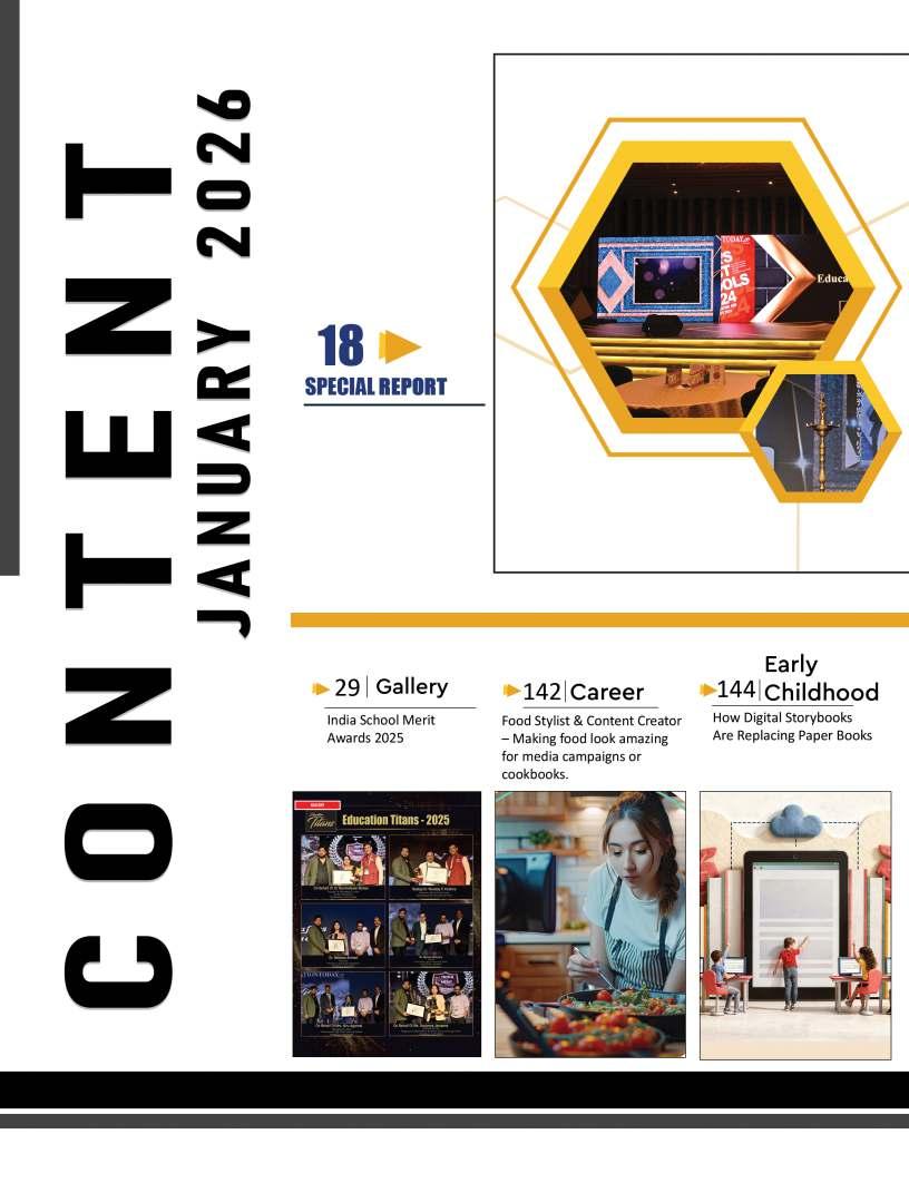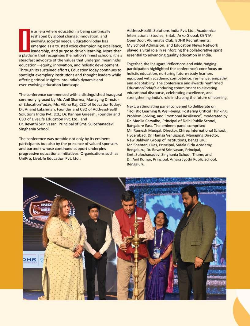 EducationTodayisprivileged topresentitsfirstissueofthe year,bothatributetothesteadfast educationcommunityshapingfuture mindsandamomentforreflection andrenewal.Themonthsaheadare poisedtounfoldtransformative narratives,progressivedialogueand insightofenduringrelevance.This issuealsoreflectsondefining milestones,notablythe13thNational ConferenceonK–12Leadership, heldalongsidetheIndiaSchoolMerit Awards2025attheTaj,Yeshwantpur, Bengaluru—anexceptionalgathering ofeducators,visionariesand policymakerscelebratinginnovation, resilienceandleadershipacrossthe educationecosystem.
