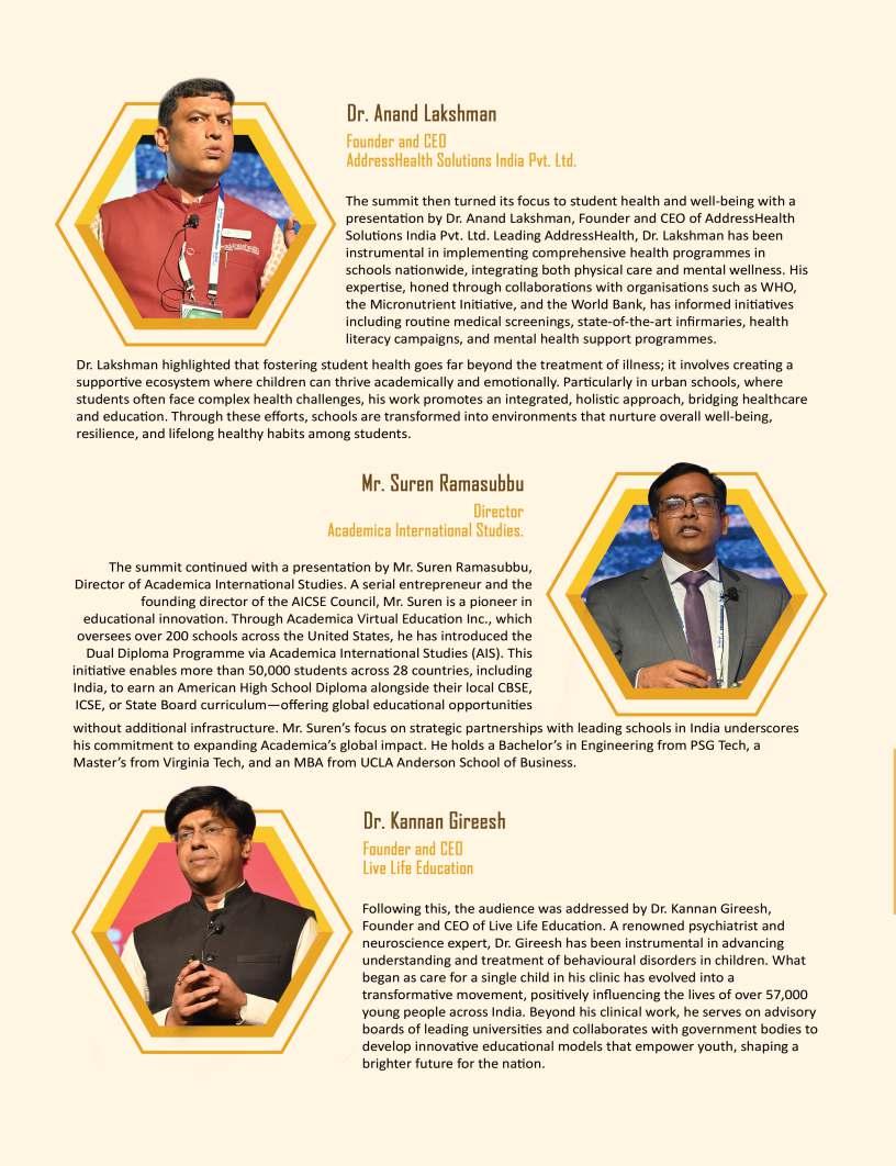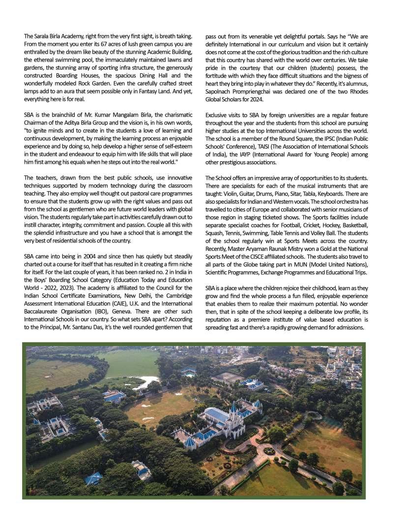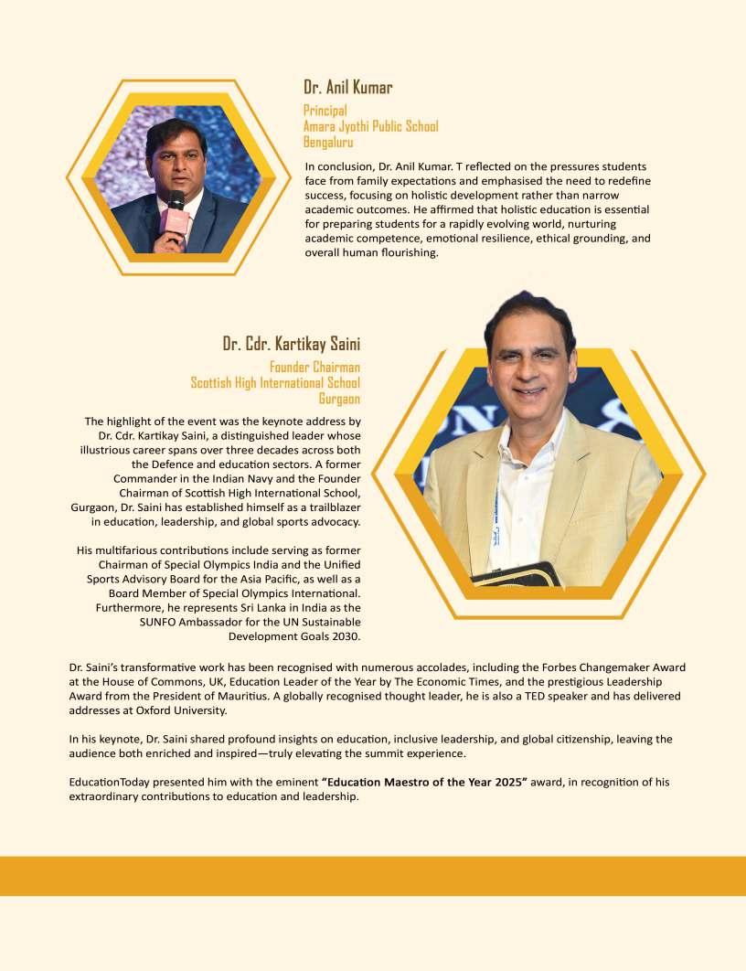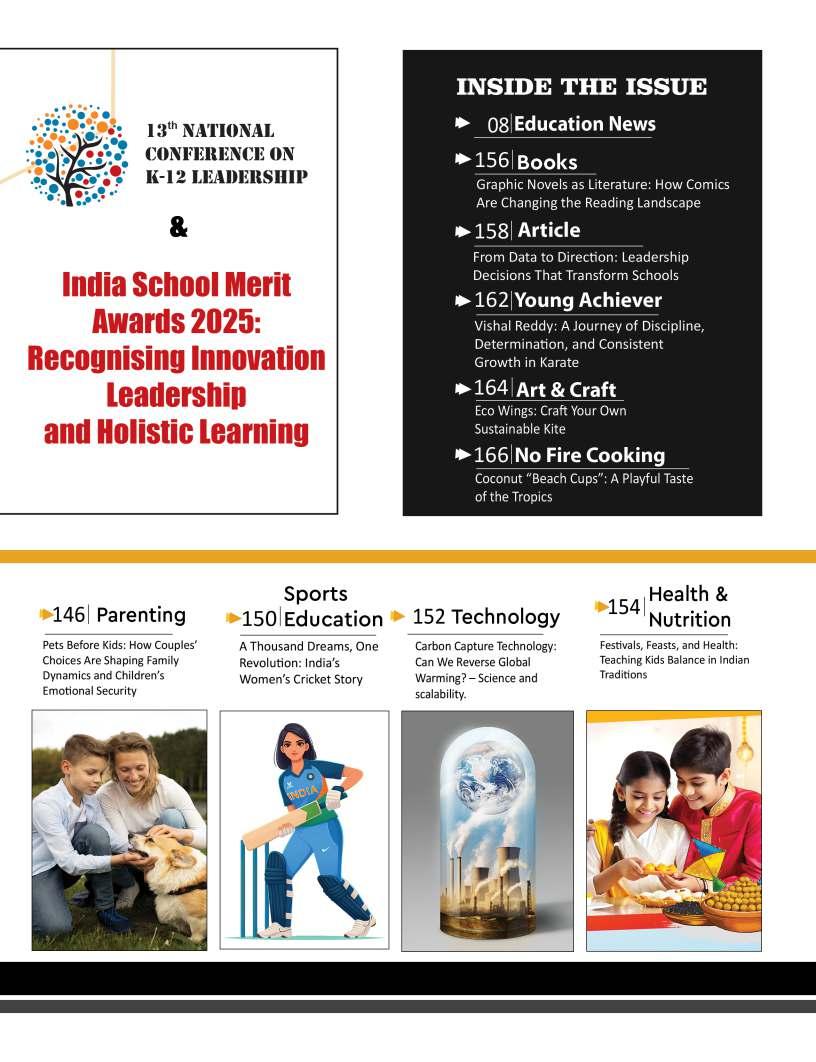 Adistinguishedhighlightofthis editionistheIndiaSchoolMerit Awardsgallery,whichproudly showcasesEducationTitans, DynamicPrincipals,Influential Leadersandotherpioneeringfigures whoseunwaveringcommitment continuestoredefineeducational benchmarks.Theirvisionary stewardshipandrelentlesspursuitof excellencehavenotonlytransformed institutionsbuthavealsocontributed meaningfullytotheevolutionof educationatlarge.Wesalutethese changemakerswhoselegacieswill undoubtedlyresonateacross generations.