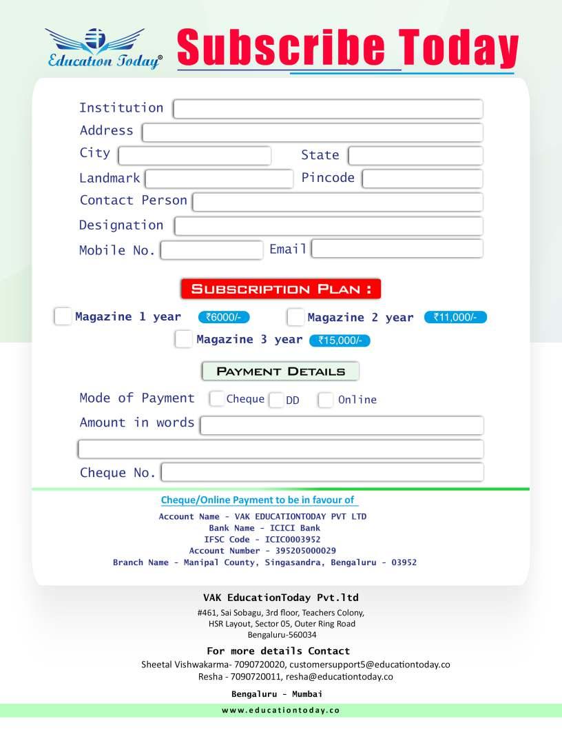Annual Subscription to our Magazine (12 issues) - Rs. 6000 admin@educationtoday.co