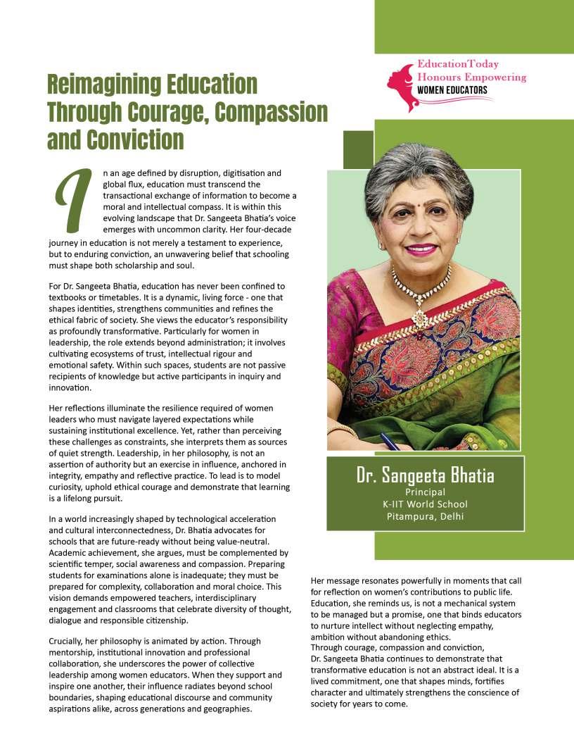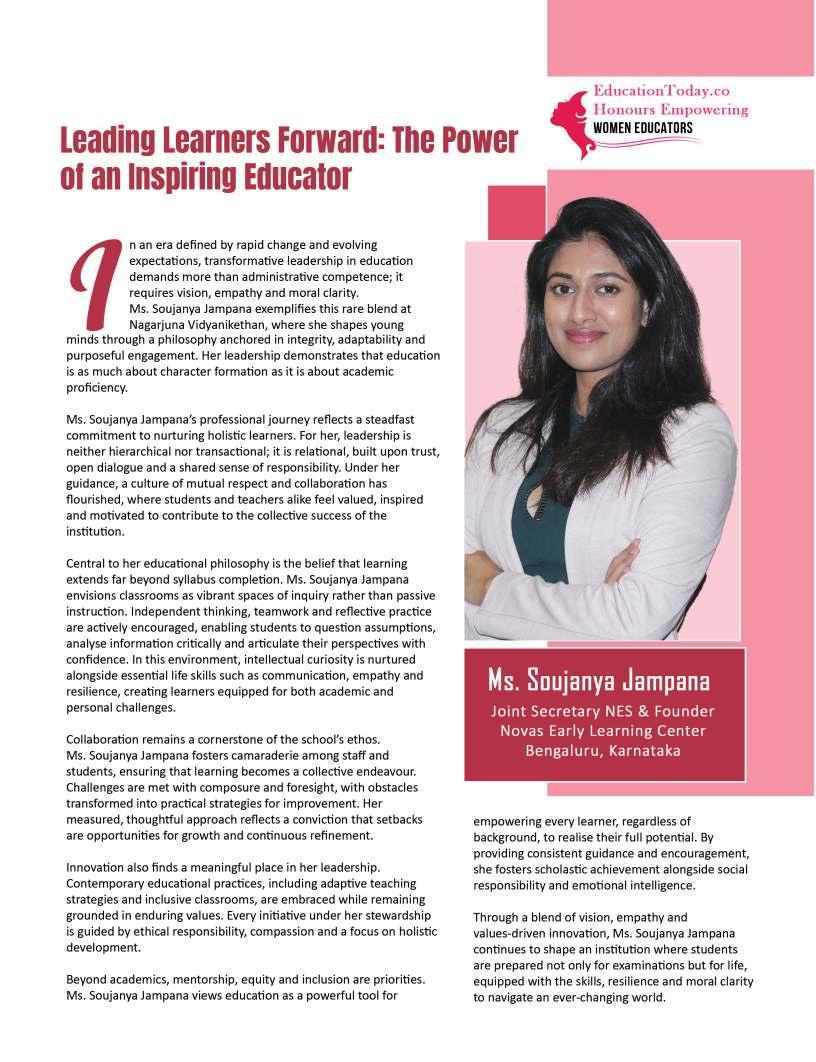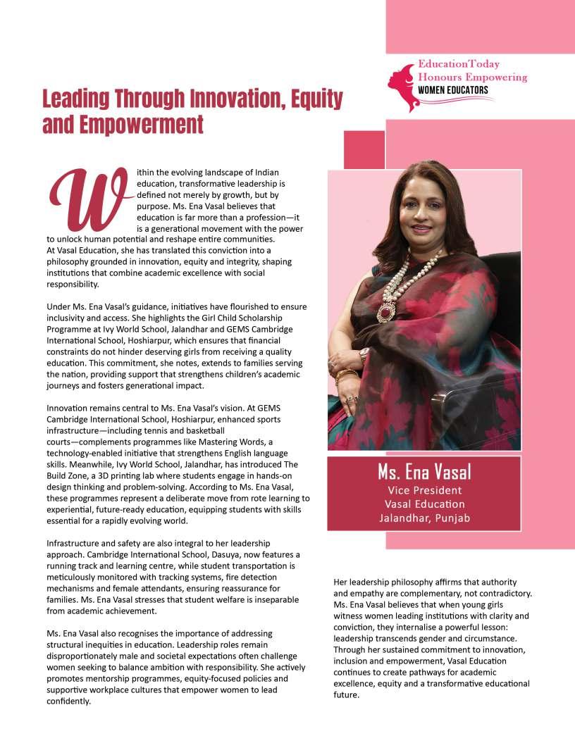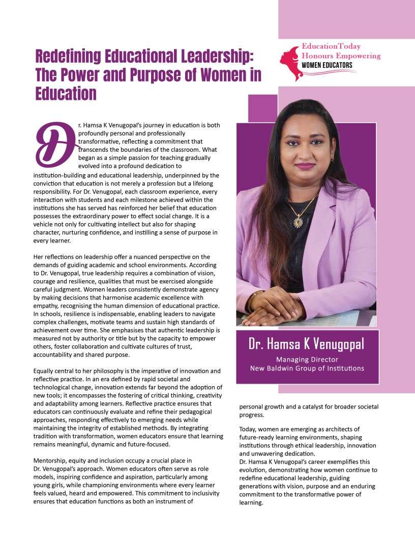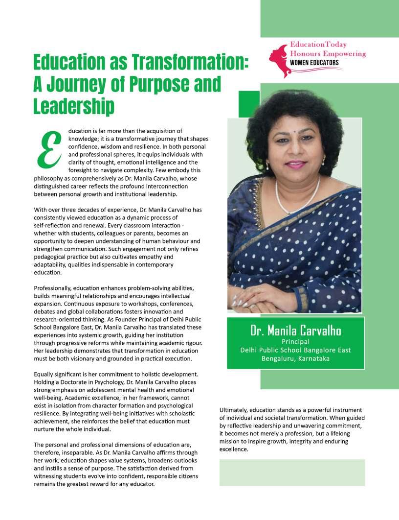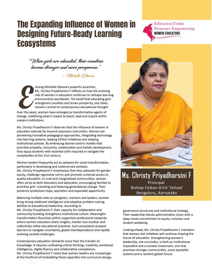 Inthisedition,wehonourwomen whoseimpactreachesfarbeyond classroomsandcampuses.They demonstratehowdedication, resilience,andcreativitycanbreak barriersandredefineleadershipin education.Theseeducatorshave championedinclusion,pioneered innovativeteachingpractices,and mentoredgenerationsoflearnersand teachersalike.Theirjourneysreveal thattrueleadershipismeasurednot bytitlesoraccolades,butbythelives touched,theopportunitiescreated, andtheinspirationtheyignite.
