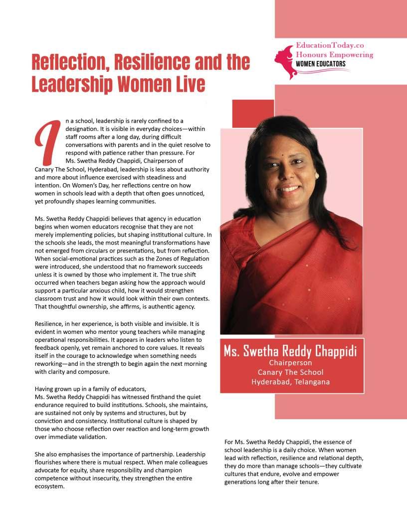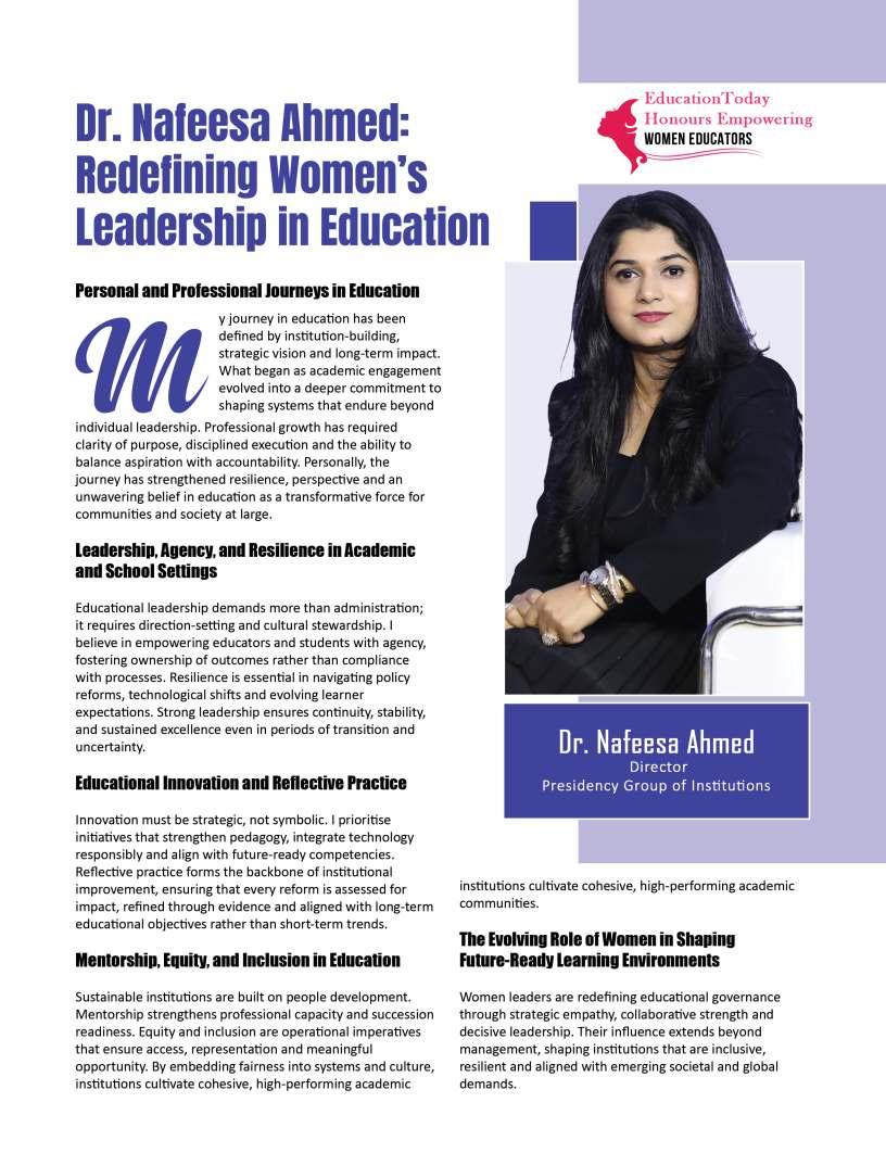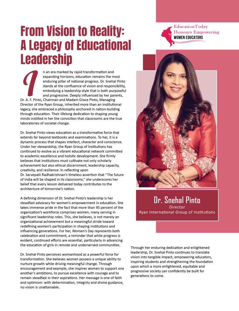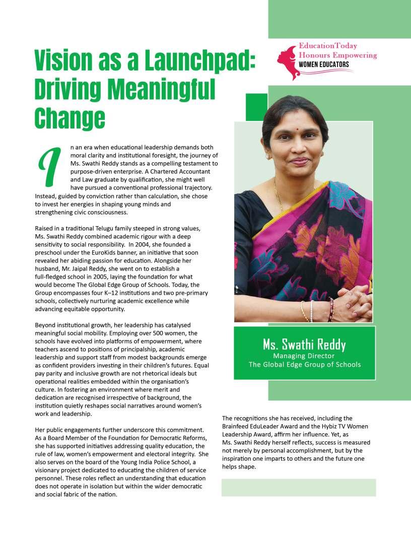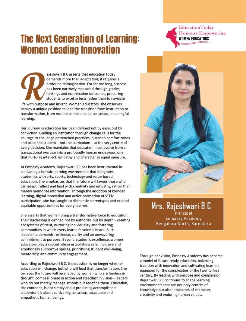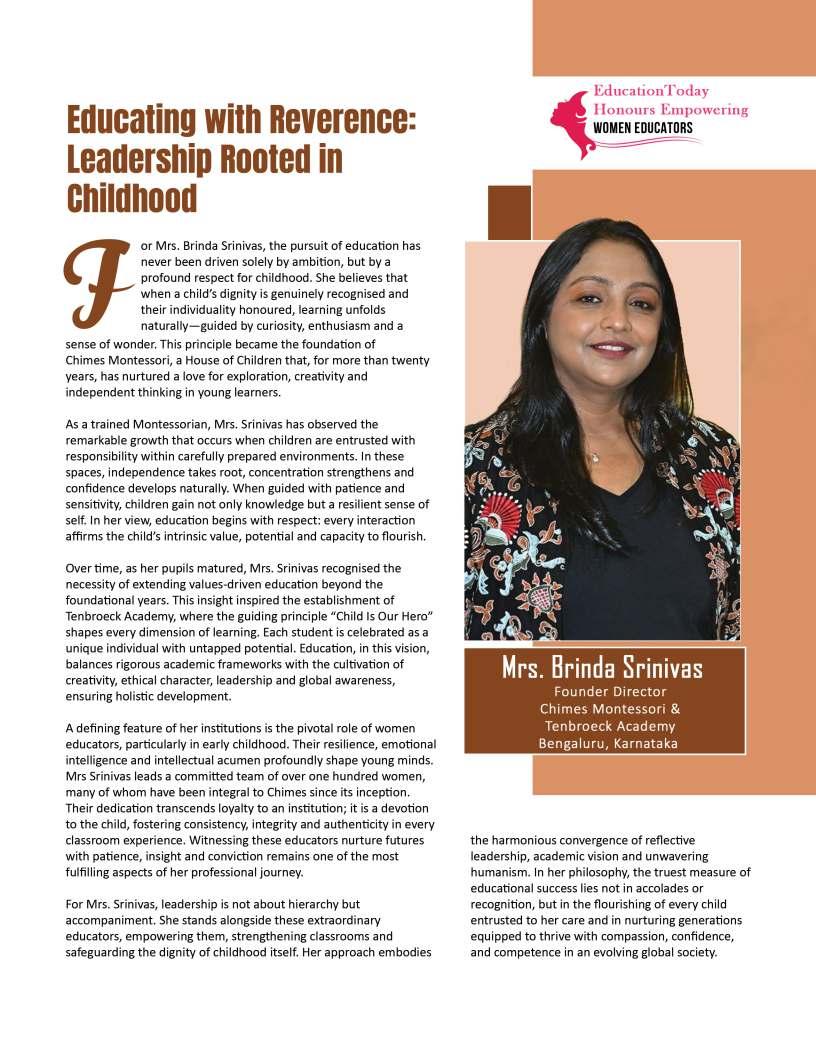 Inthisedition,wehonourwomen whoseimpactreachesfarbeyond classroomsandcampuses.They demonstratehowdedication, resilience,andcreativitycanbreak barriersandredefineleadershipin education.Theseeducatorshave championedinclusion,pioneered innovativeteachingpractices,and mentoredgenerationsoflearnersand teachersalike.Theirjourneysreveal thattrueleadershipismeasurednot bytitlesoraccolades,butbythelives touched,theopportunitiescreated, andtheinspirationtheyignite.