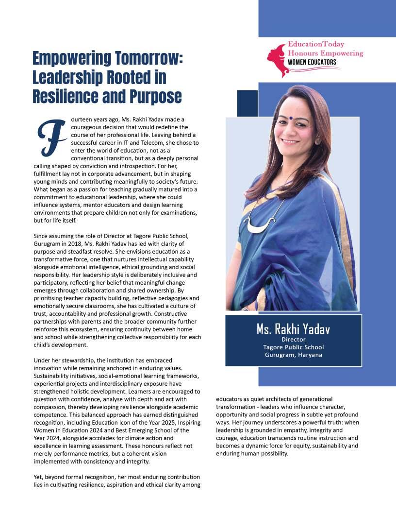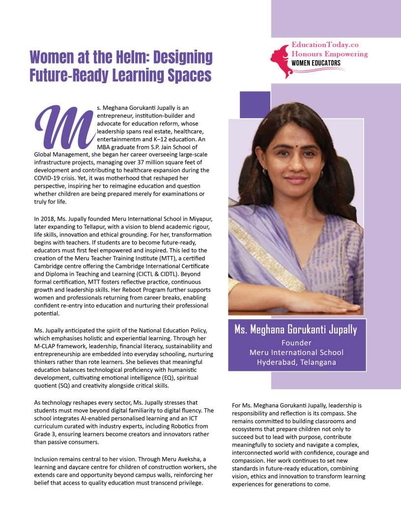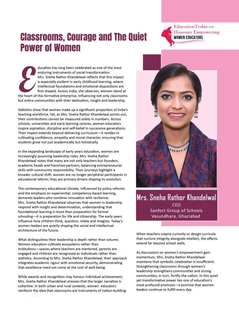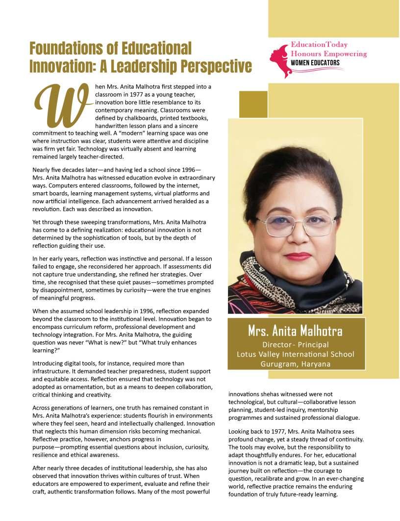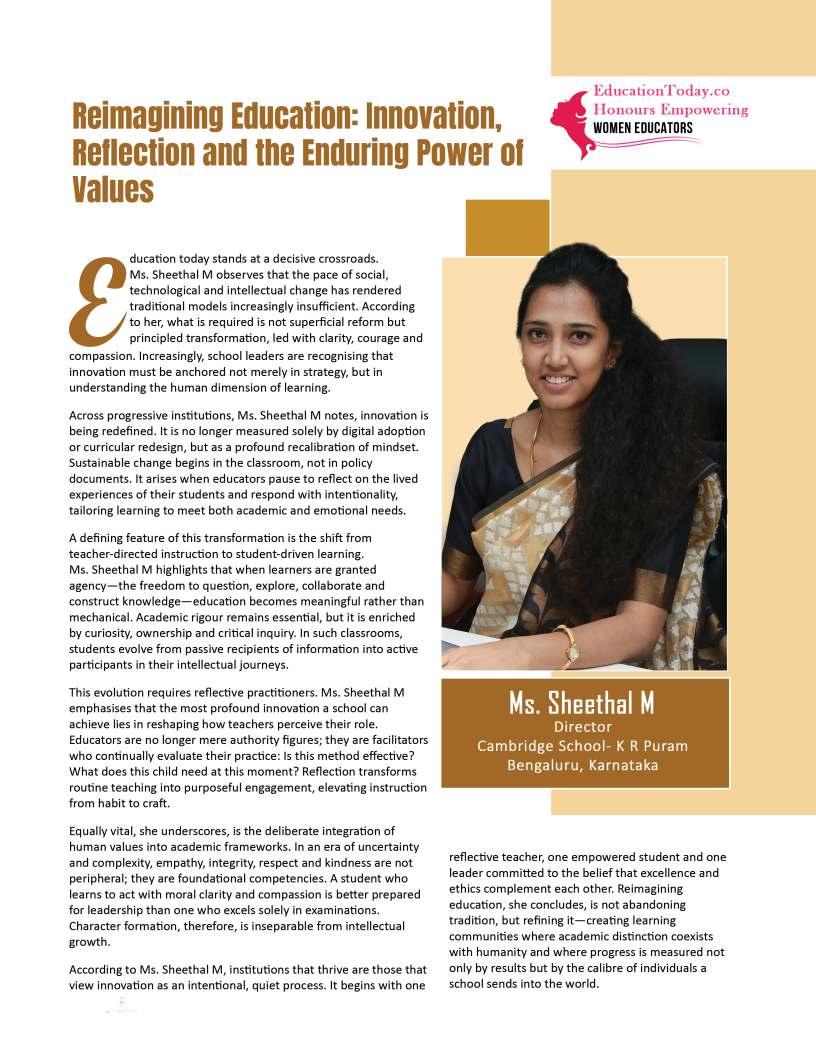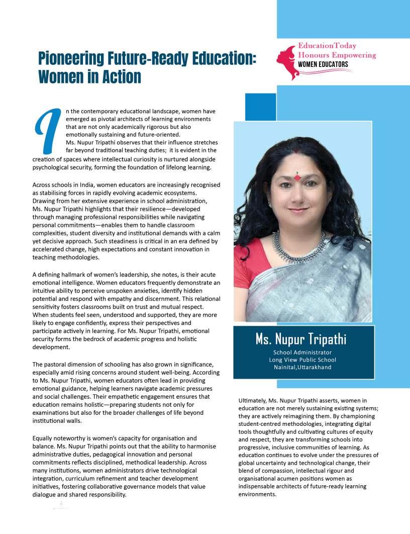 Inthisedition,wehonourwomen whoseimpactreachesfarbeyond classroomsandcampuses.They demonstratehowdedication, resilience,andcreativitycanbreak barriersandredefineleadershipin education.Theseeducatorshave championedinclusion,pioneered innovativeteachingpractices,and mentoredgenerationsoflearnersand teachersalike.Theirjourneysreveal thattrueleadershipismeasurednot bytitlesoraccolades,butbythelives touched,theopportunitiescreated, andtheinspirationtheyignite.
