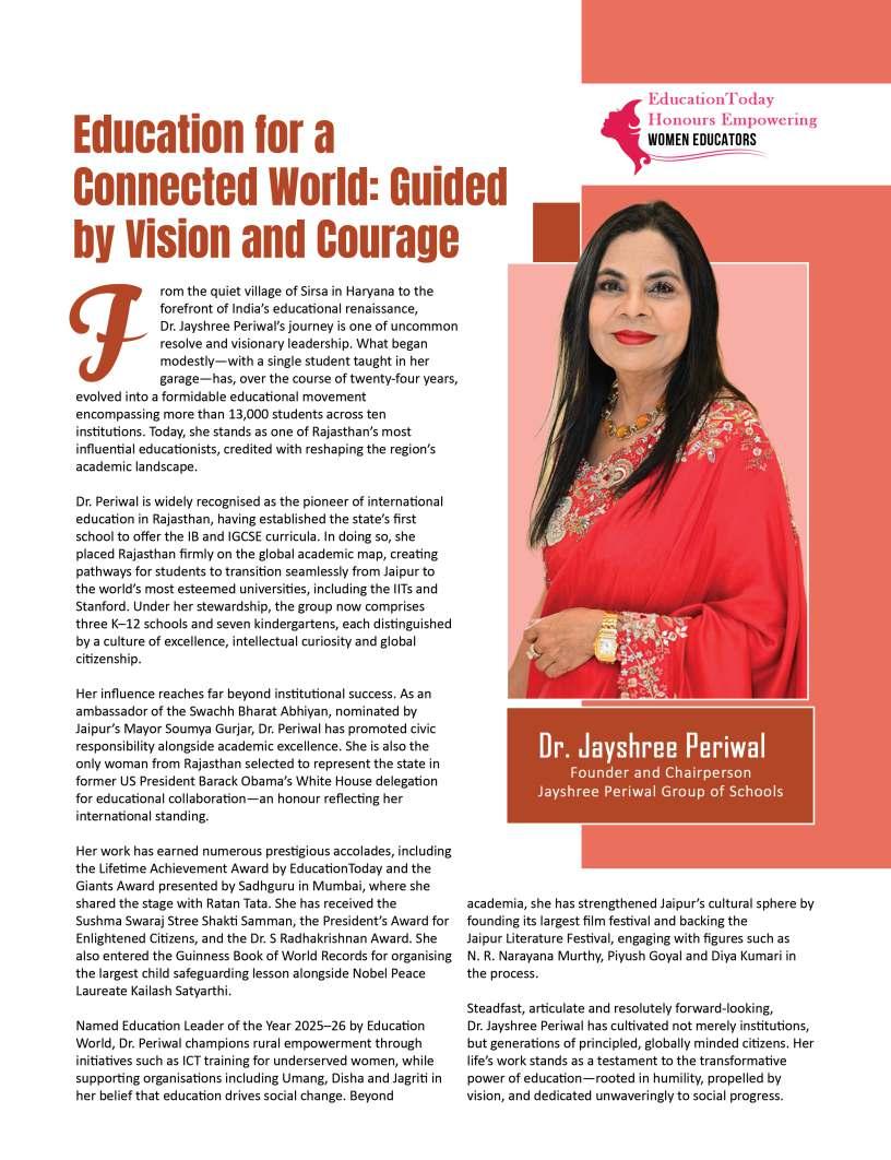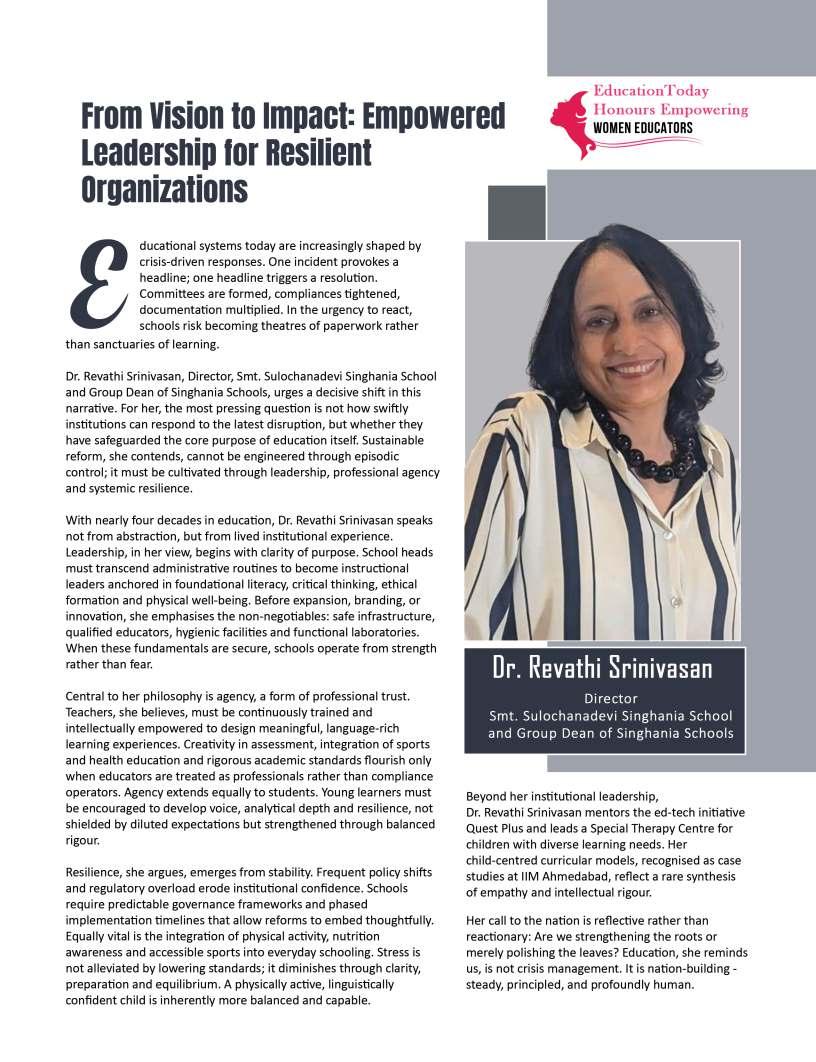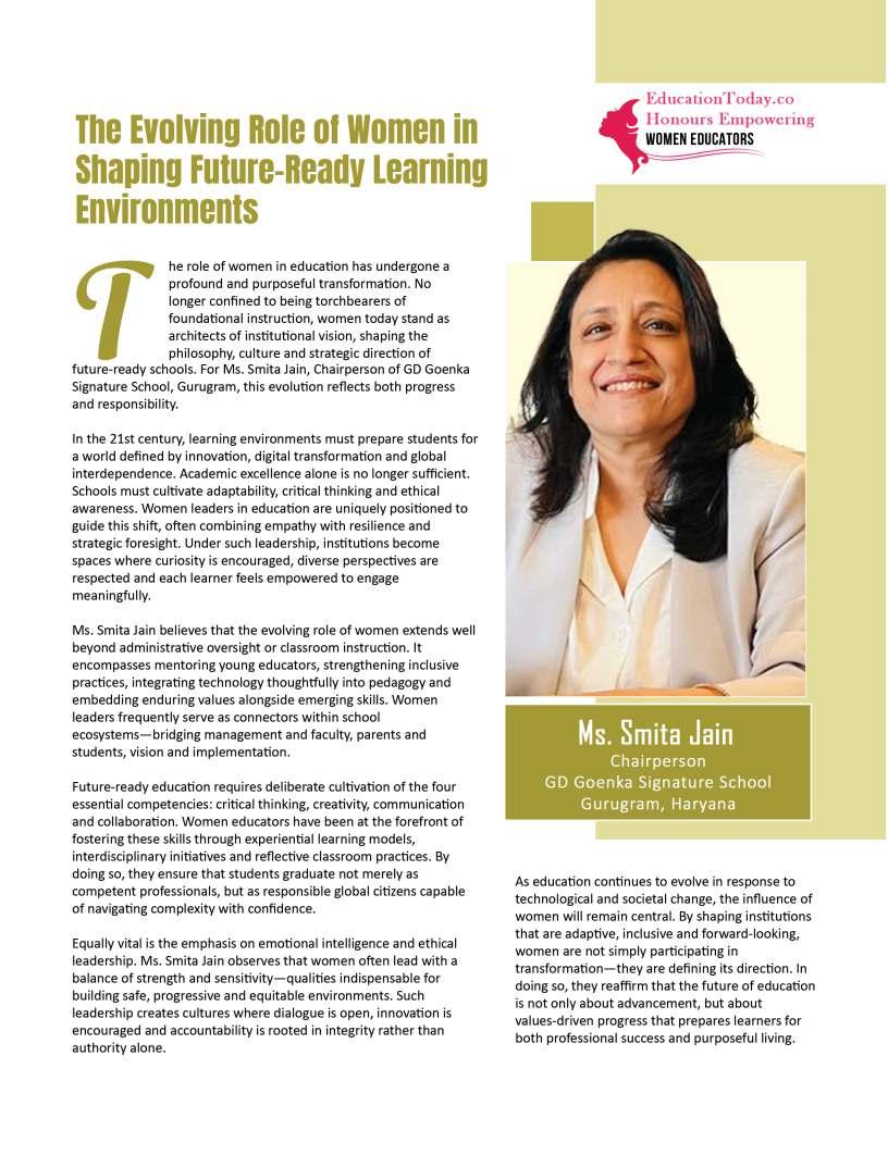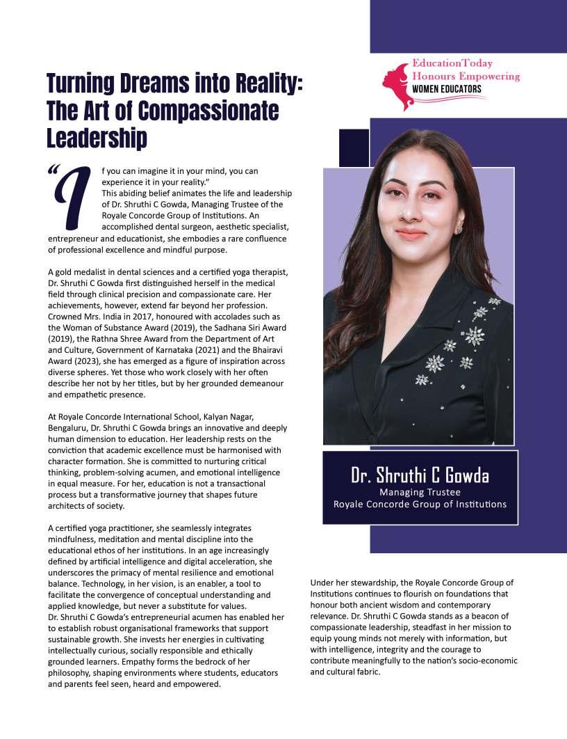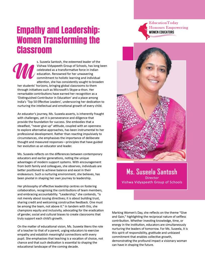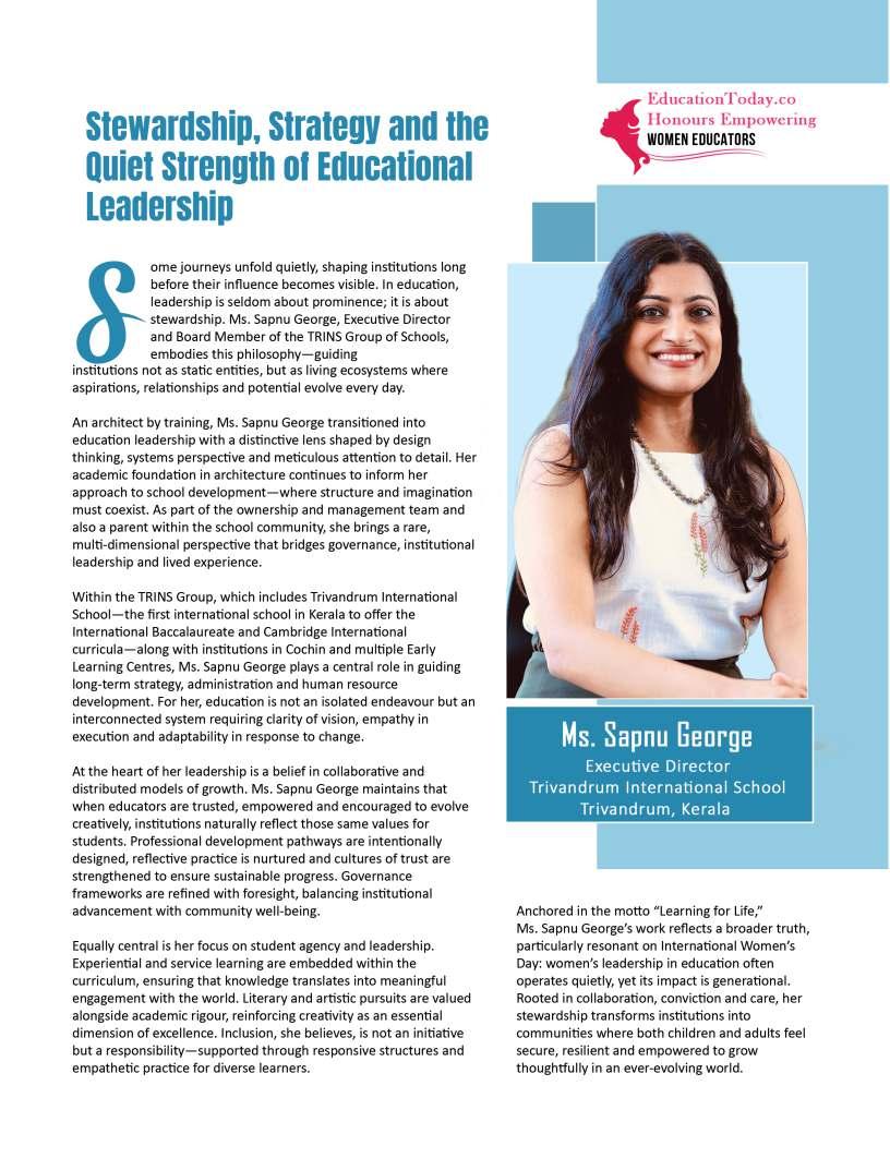 Inthisedition,wehonourwomen whoseimpactreachesfarbeyond classroomsandcampuses.They demonstratehowdedication, resilience,andcreativitycanbreak barriersandredefineleadershipin education.Theseeducatorshave championedinclusion,pioneered innovativeteachingpractices,and mentoredgenerationsoflearnersand teachersalike.Theirjourneysreveal thattrueleadershipismeasurednot bytitlesoraccolades,butbythelives touched,theopportunitiescreated, andtheinspirationtheyignite.