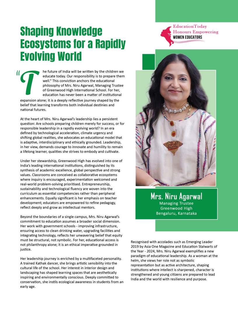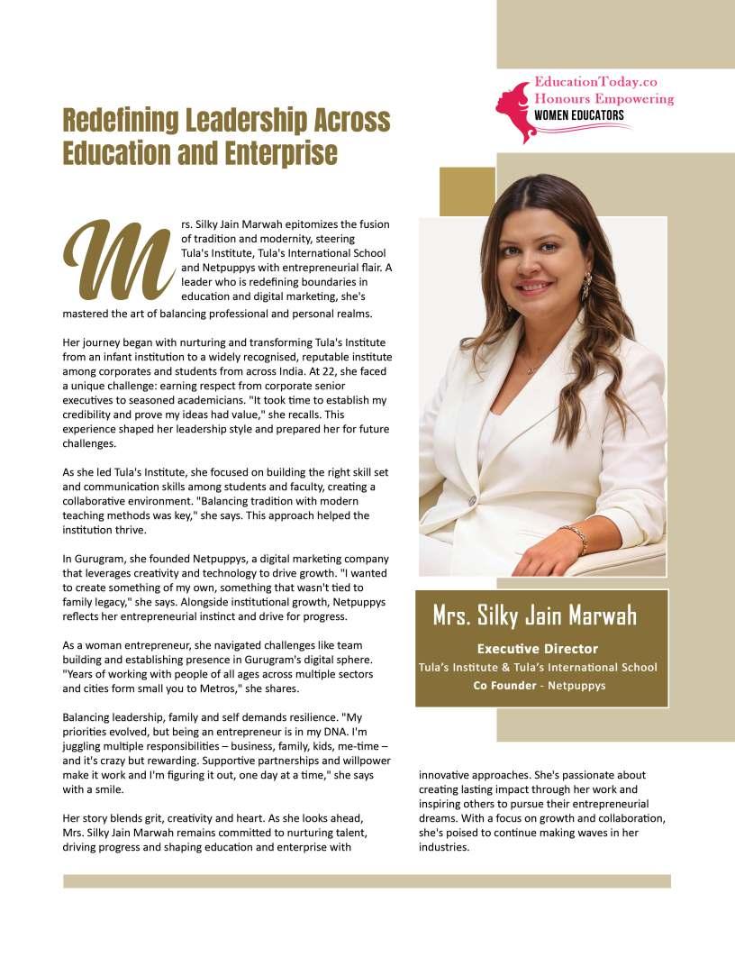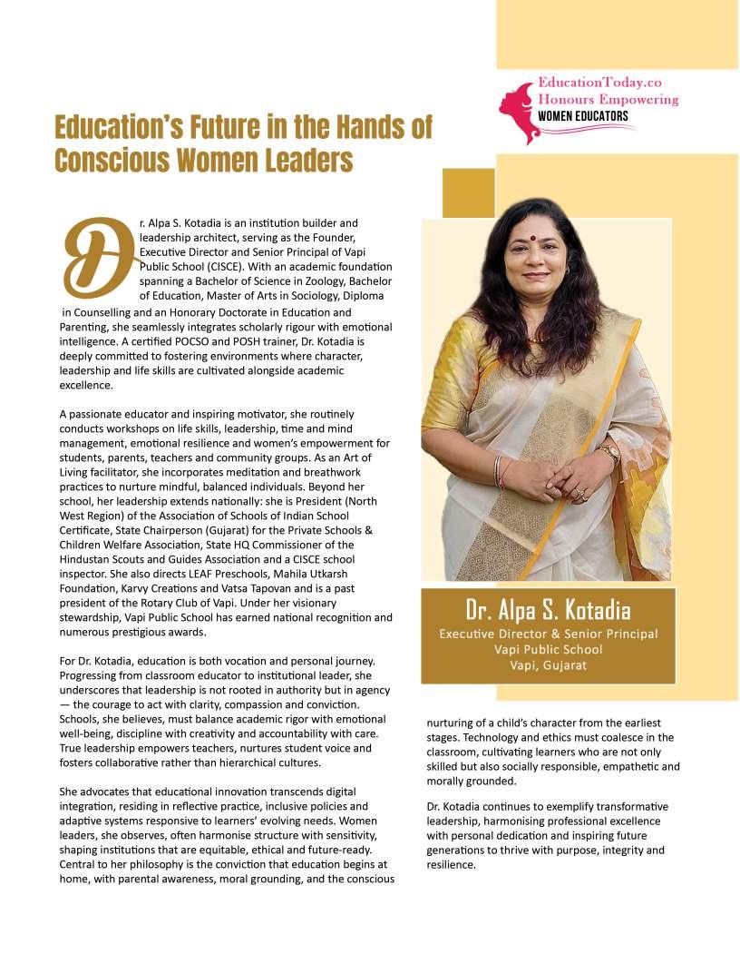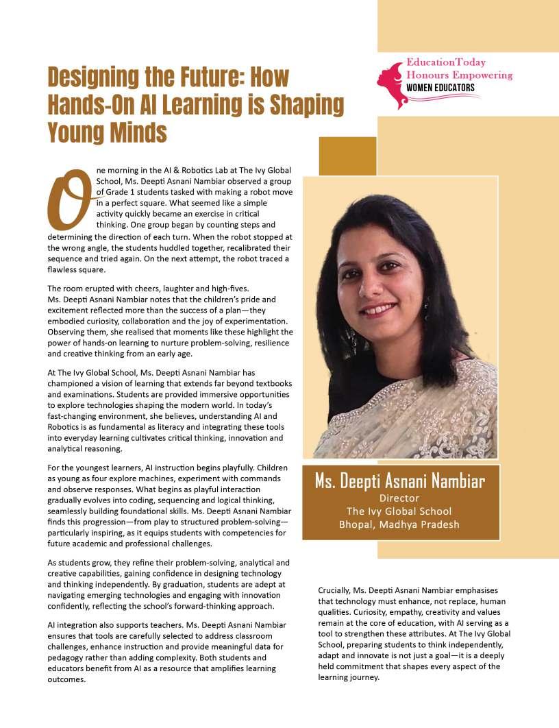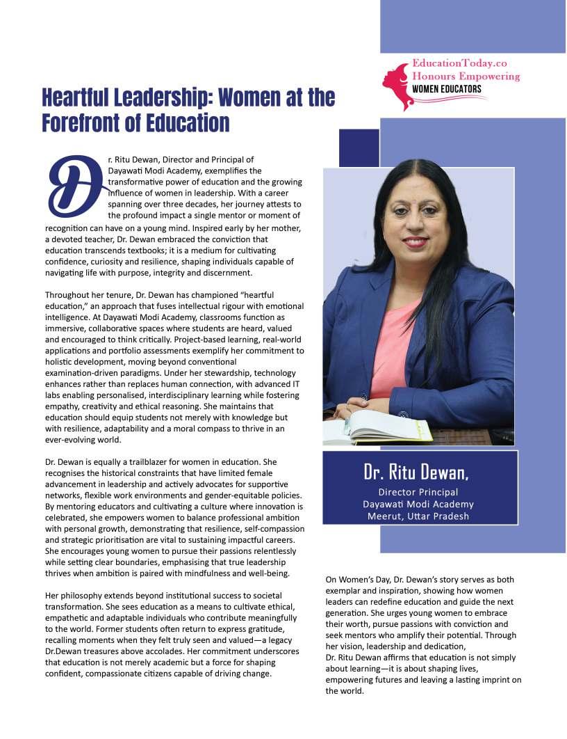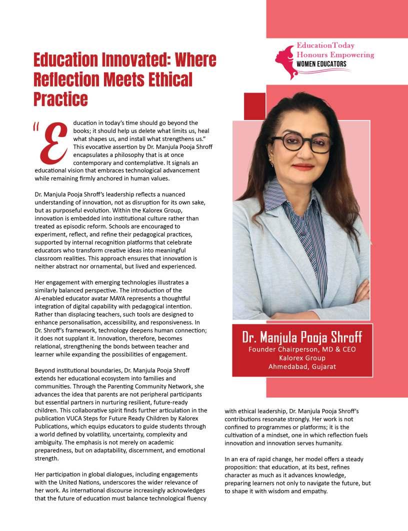 Inthisedition,wehonourwomen whoseimpactreachesfarbeyond classroomsandcampuses.They demonstratehowdedication, resilience,andcreativitycanbreak barriersandredefineleadershipin education.Theseeducatorshave championedinclusion,pioneered innovativeteachingpractices,and mentoredgenerationsoflearnersand teachersalike.Theirjourneysreveal thattrueleadershipismeasurednot bytitlesoraccolades,butbythelives touched,theopportunitiescreated, andtheinspirationtheyignite.