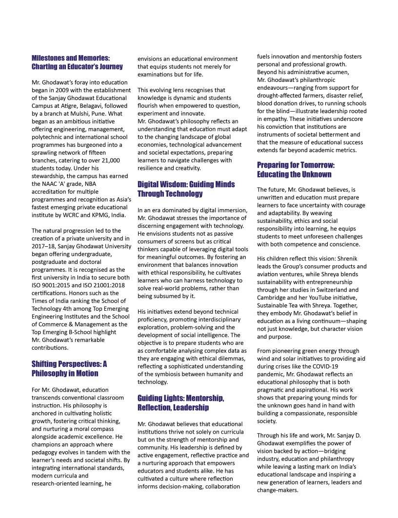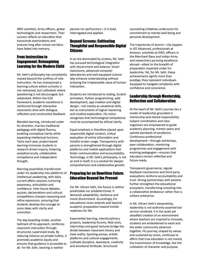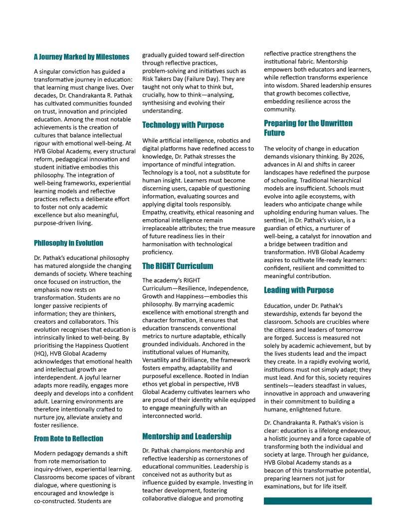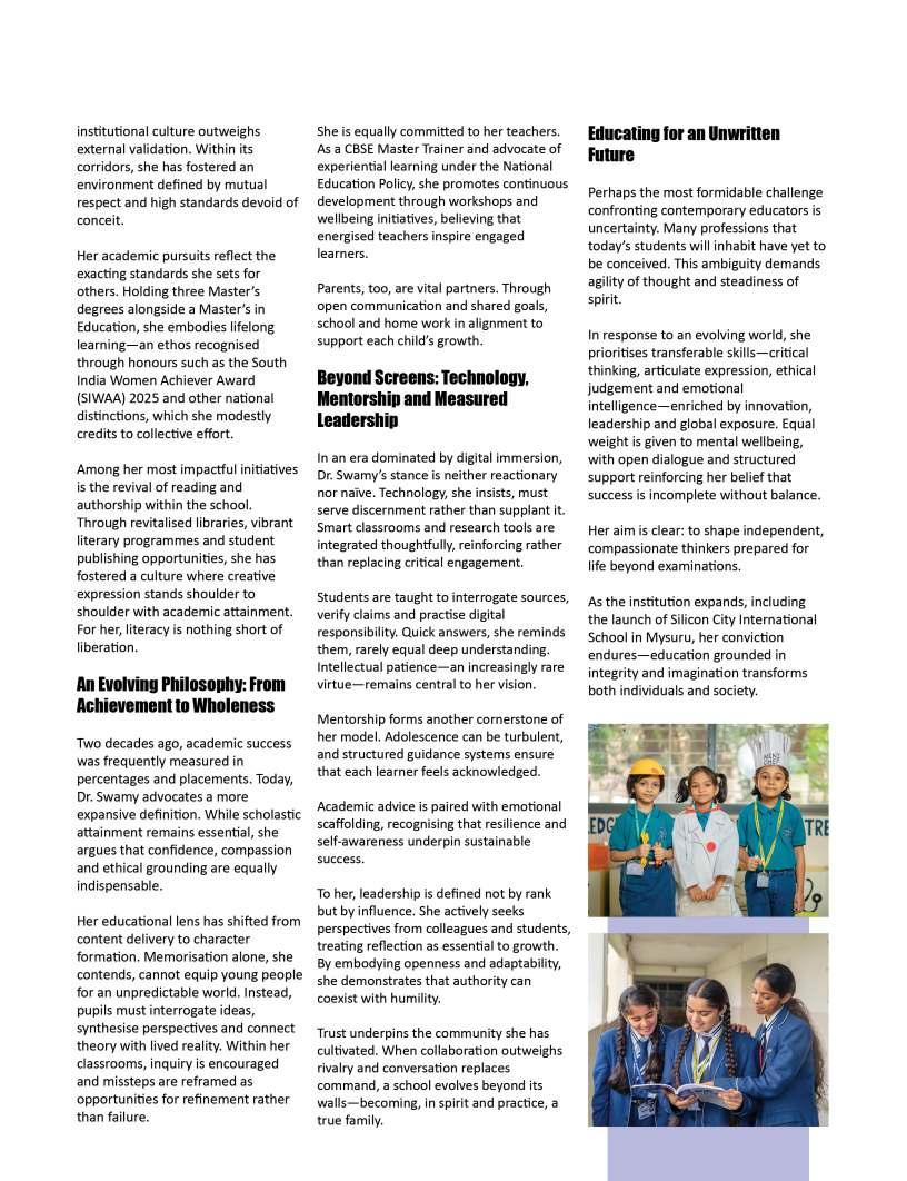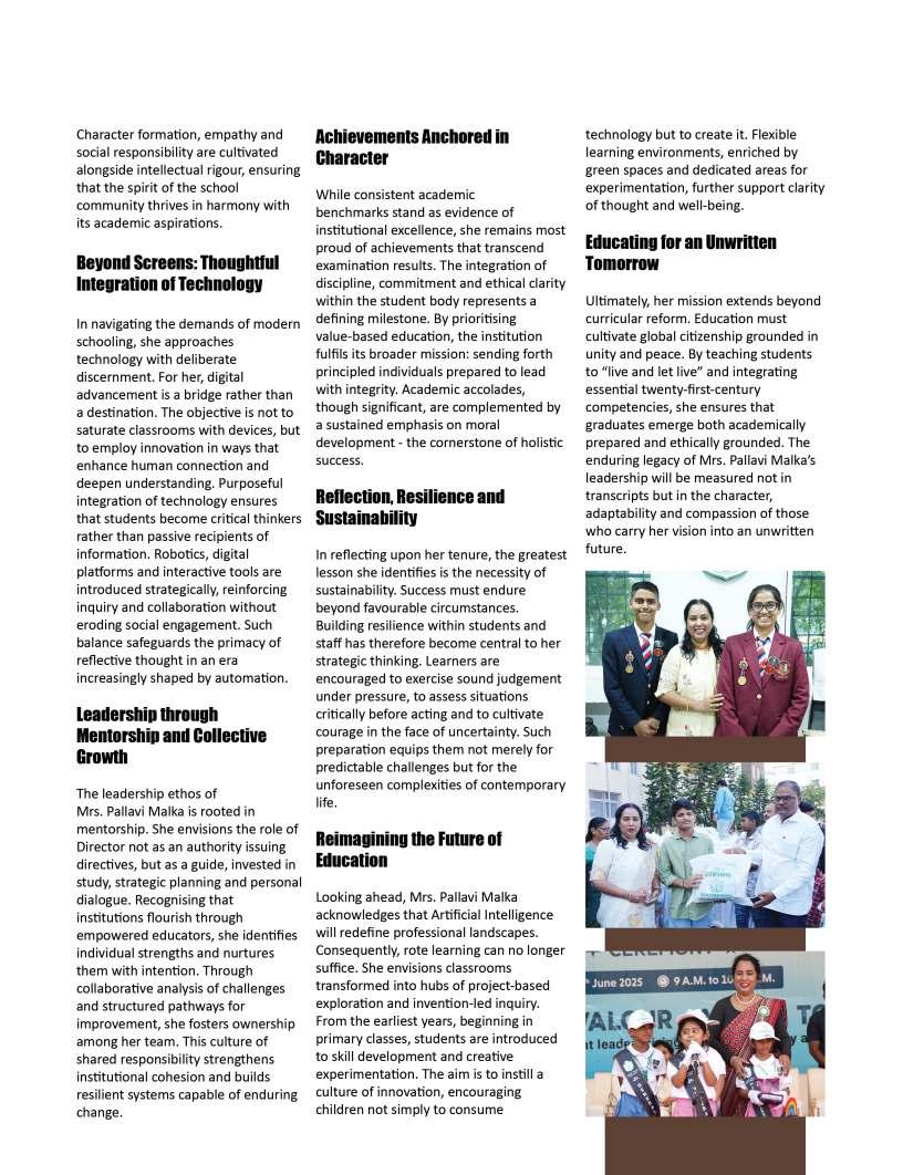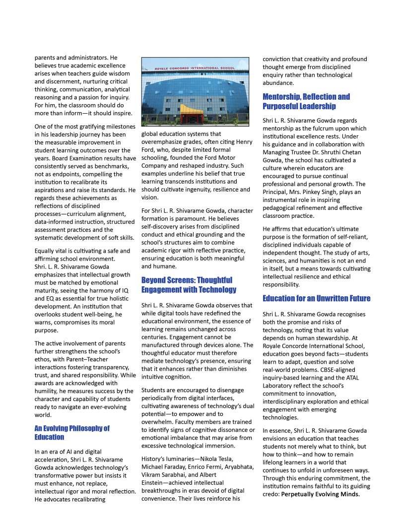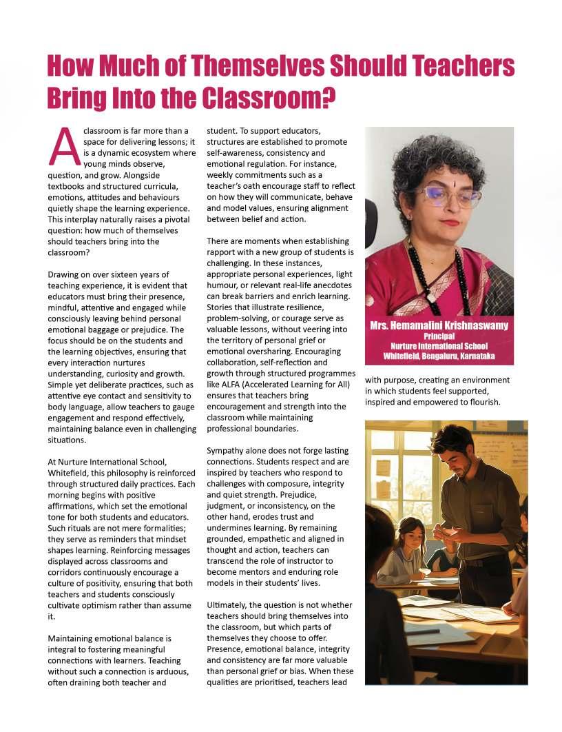 thecornerstoneofprogress, yetbehindeverythriving institutionandeveryconfidentlearner standsthequietinfluenceof dedicatededucators.Their commitmentgoesfarbeyond classroomsandcurriculum;itliesin nurturingcuriosity,shapingcharacter, andguidingyoungmindstoward purposefulfutures.Inaneradefined byrapidchange,theroleofeducators hasbecomeevenmoreprofoundtheyarementors,innovators,and torchbearersofhopeforgenerations tocome.