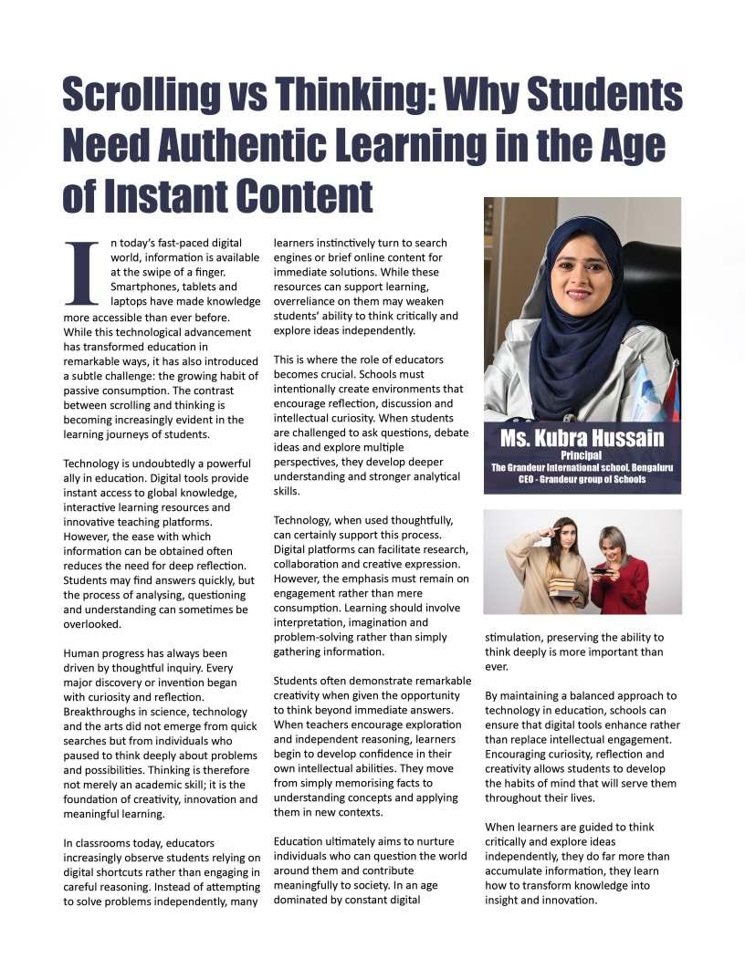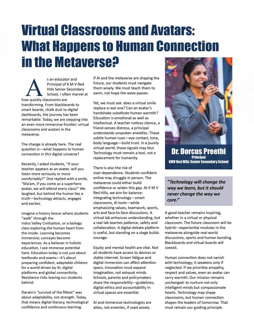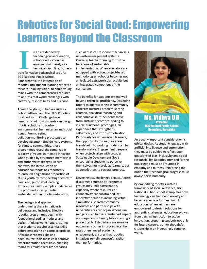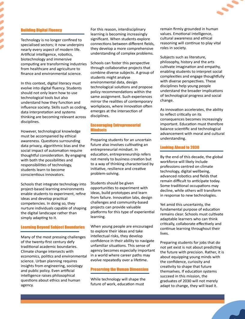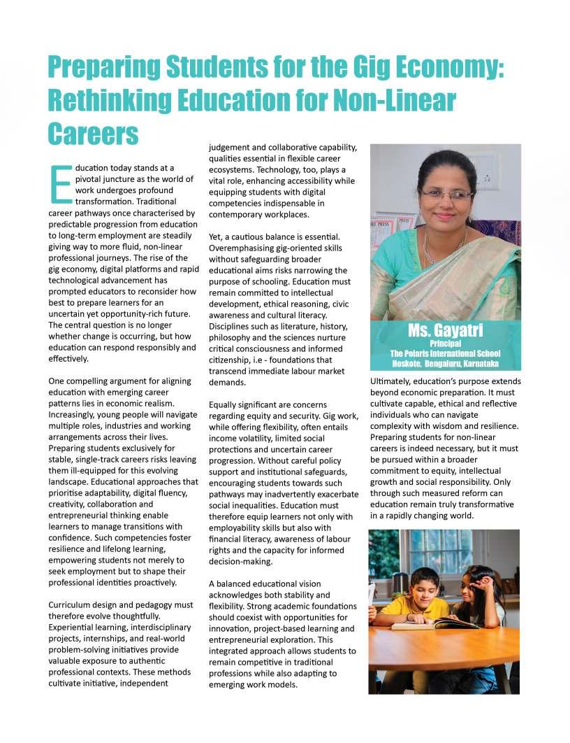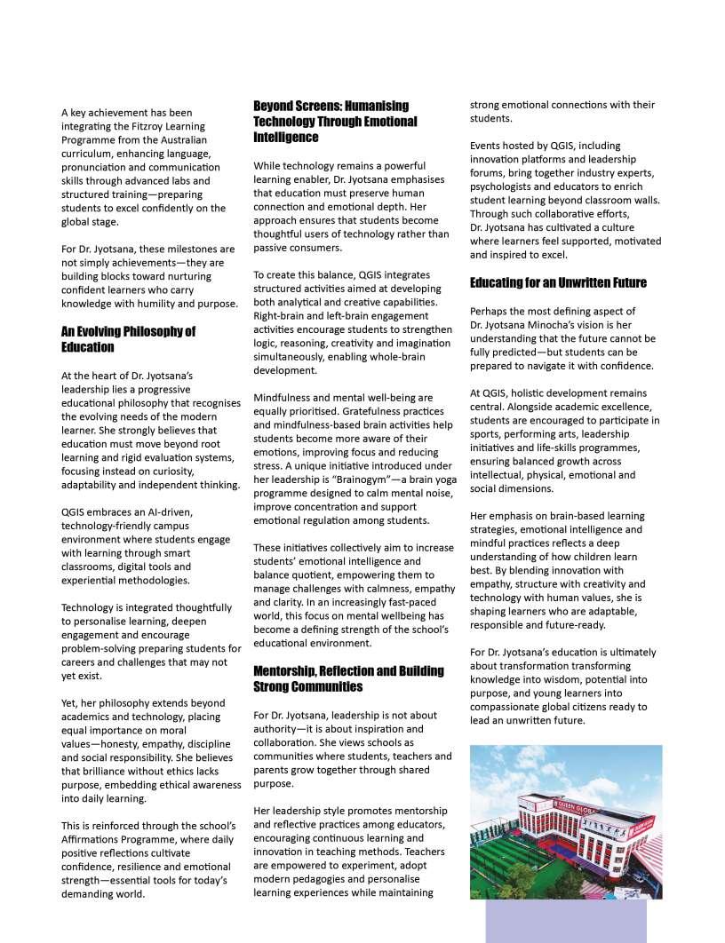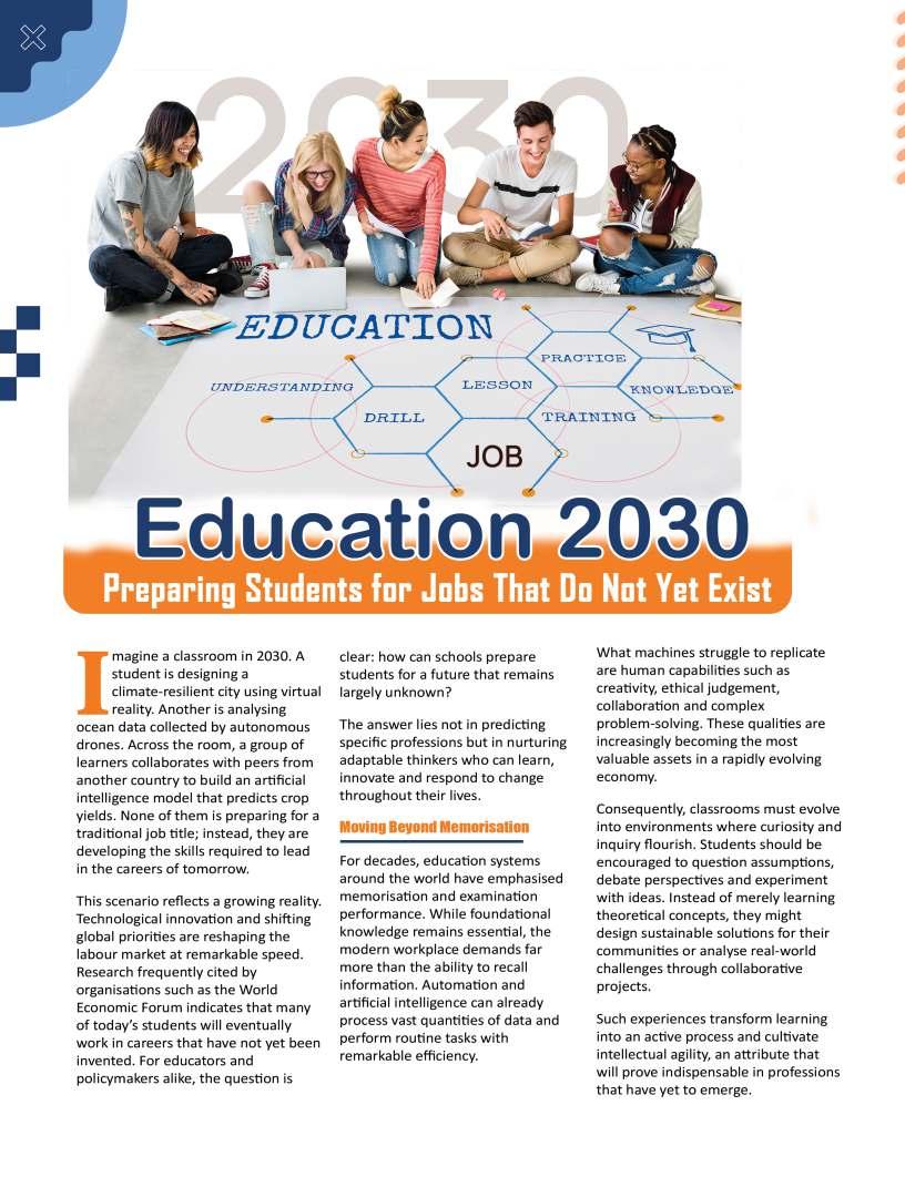 Alongsidetheseinspiringnarratives, thiseditionbringstogetheradiverse collectionofthought-provoking articlesaddressingtheevolving landscapeofeducation.Readerswill findinsightsonemergingpedagogical approaches,thegrowinginfluenceof technologyinclassrooms,andthe importanceofholisticdevelopmentin shapingwell-roundedlearners.We alsoexplorethemessurrounding studentwell-being,futurecareer pathways,andtheexpanding opportunitieswithinglobaleducation frameworks.