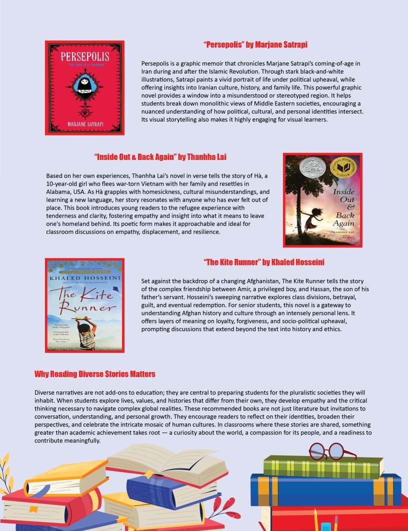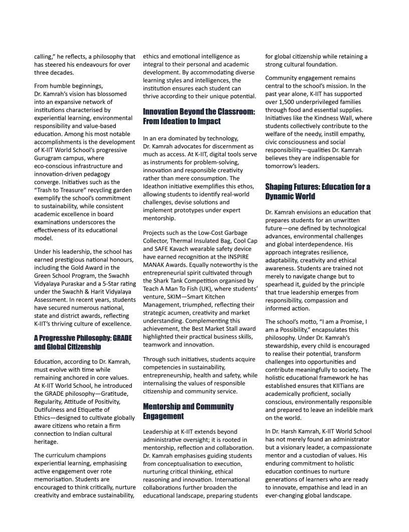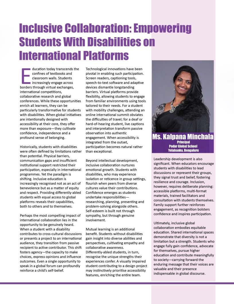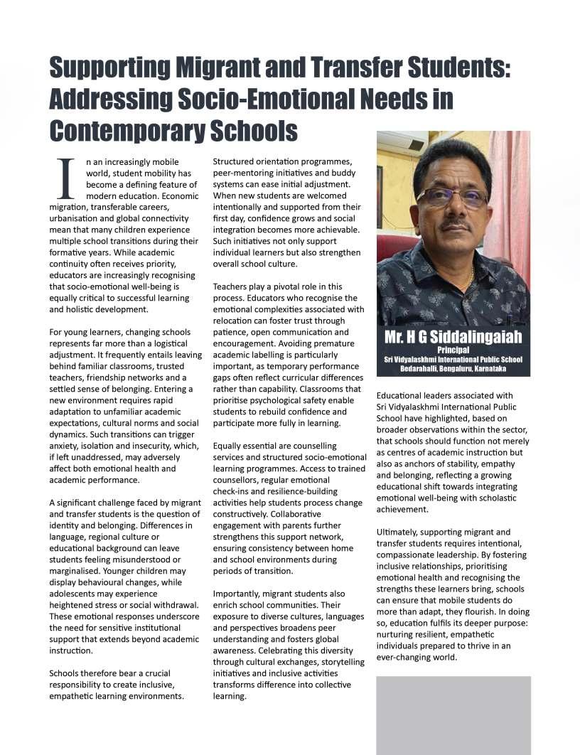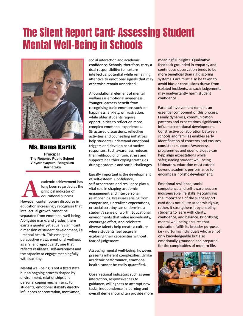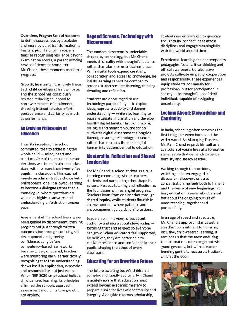 Alongsidetheseinspiringnarratives, thiseditionbringstogetheradiverse collectionofthought-provoking articlesaddressingtheevolving landscapeofeducation.Readerswill findinsightsonemergingpedagogical approaches,thegrowinginfluenceof technologyinclassrooms,andthe importanceofholisticdevelopmentin shapingwell-roundedlearners.We alsoexplorethemessurrounding studentwell-being,futurecareer pathways,andtheexpanding opportunitieswithinglobaleducation frameworks.