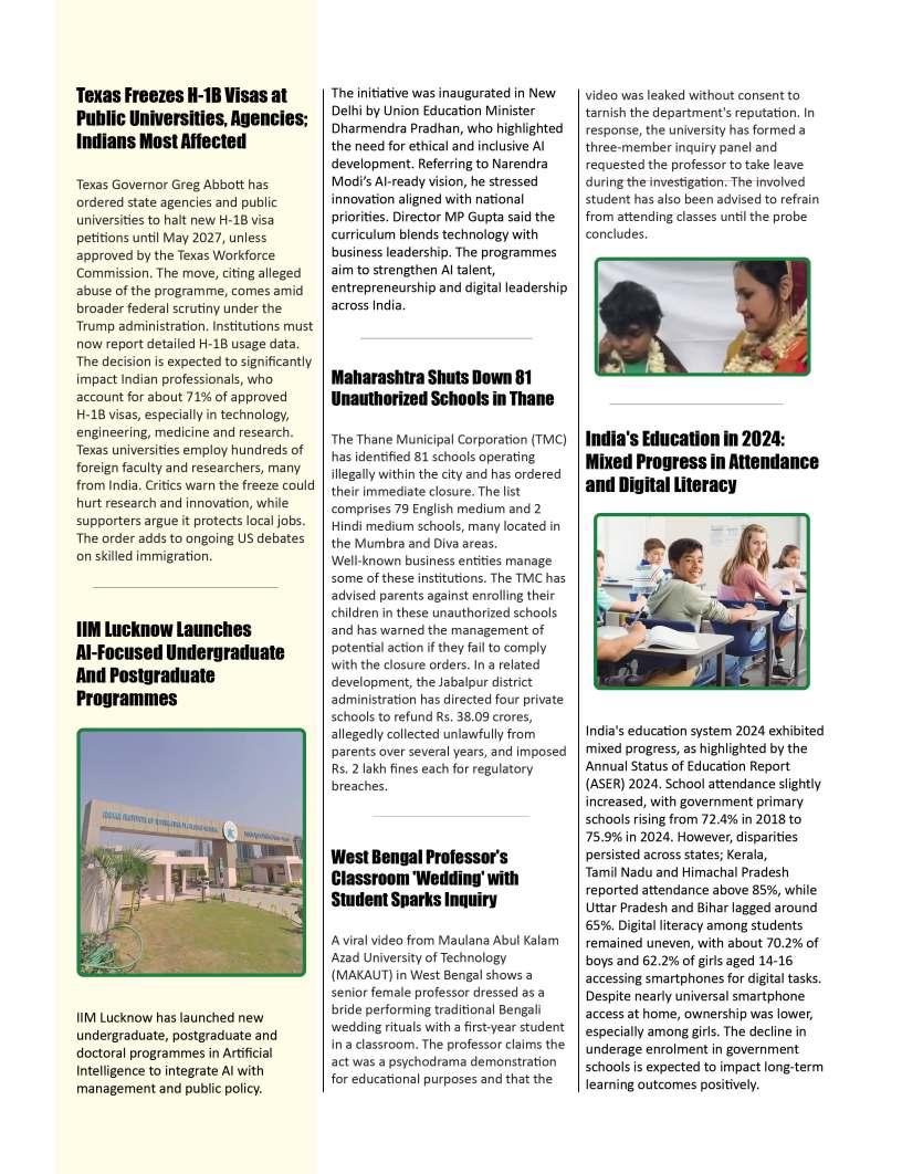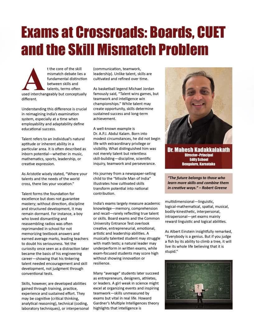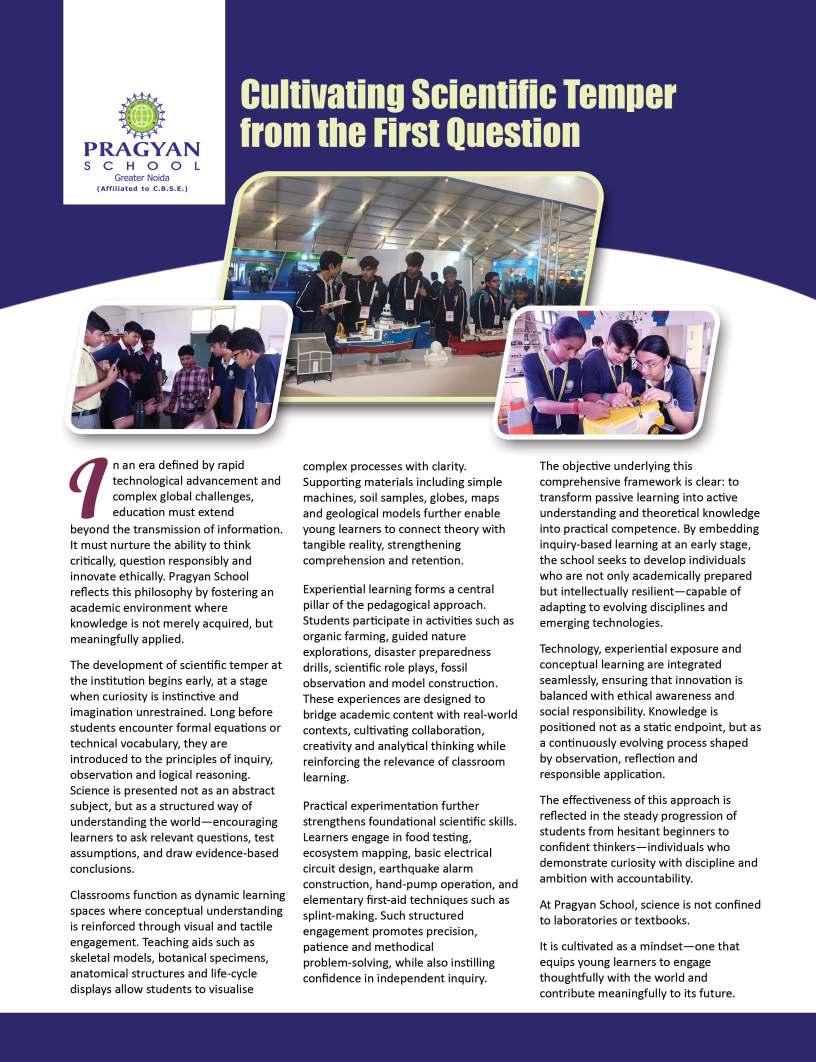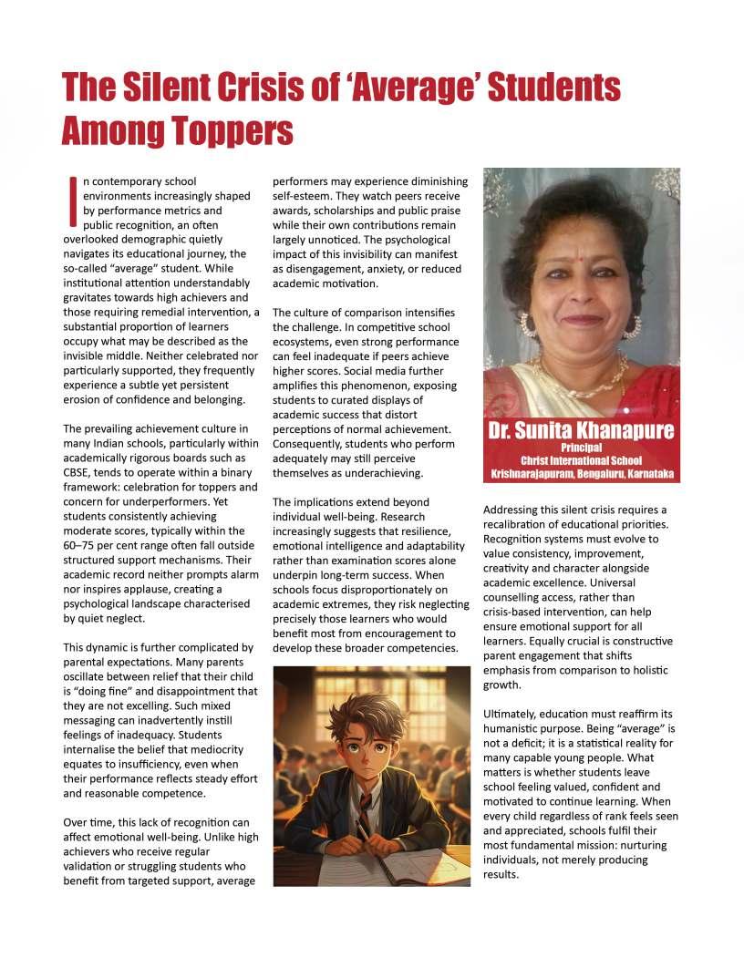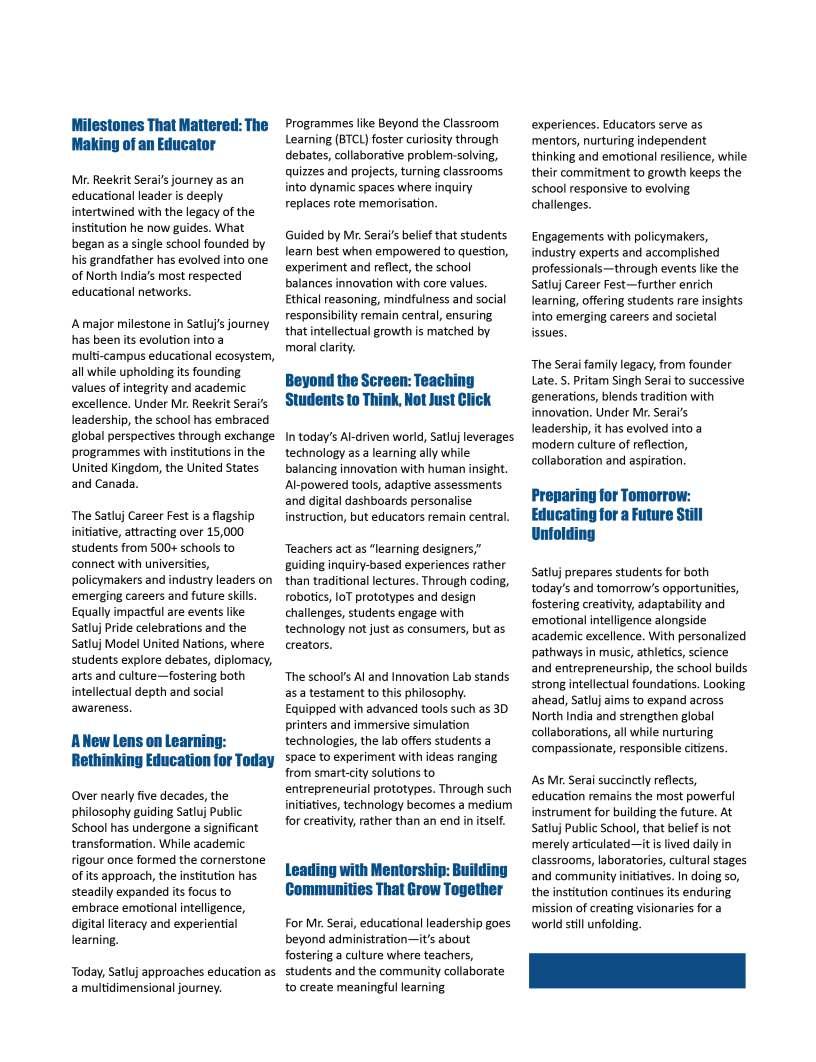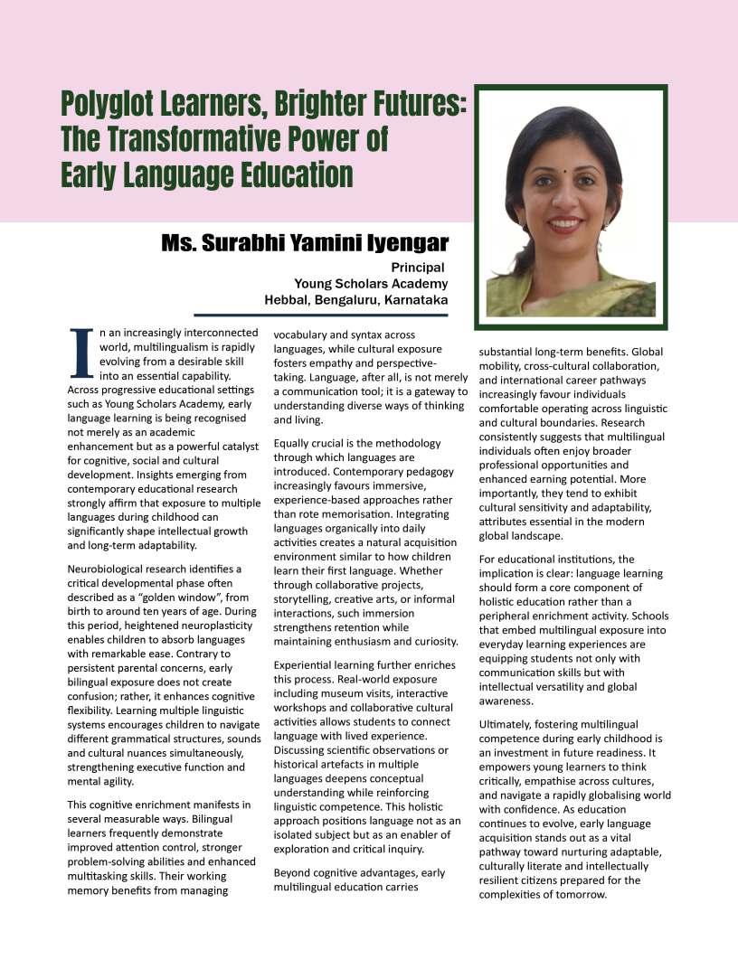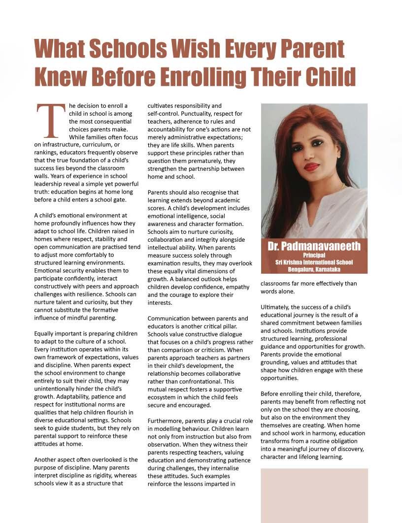 Alongsidetheseinspiringnarratives, thiseditionbringstogetheradiverse collectionofthought-provoking articlesaddressingtheevolving landscapeofeducation.Readerswill findinsightsonemergingpedagogical approaches,thegrowinginfluenceof technologyinclassrooms,andthe importanceofholisticdevelopmentin shapingwell-roundedlearners.We alsoexplorethemessurrounding studentwell-being,futurecareer pathways,andtheexpanding opportunitieswithinglobaleducation frameworks.