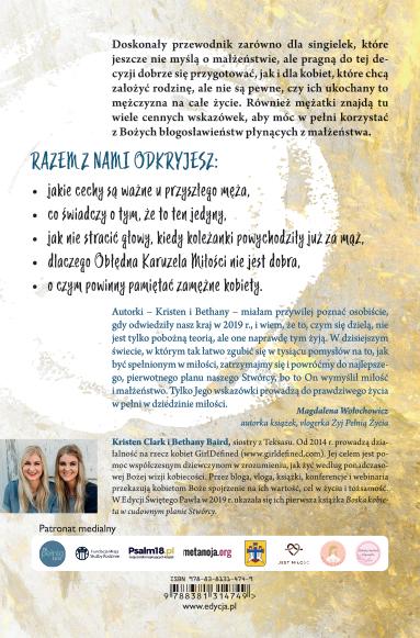 Przez ostatnią dekadę obydwie zgłębiałyśmy słowo Boże i odkryłyśmy diametralnie lepsze podejście do miłości i związków – podejście, które stawia Chrystusa w centrum naszego życia Niezależniemiłosnego.odtego,na jakim etapie życia obecnie jesteś, wierzymy, że słowo Boże ma dla ciebie konkretne i pomocne odpowiedzi. W końcu to Bóg stworzył miłość i małżeństwo, więc najlepiej wie, jak się w tym poruszać.