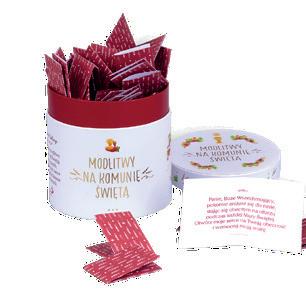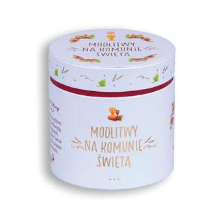 Mamy dla Ciebie propozycję – 52 krótkie modlitwy na Komunię Świętą, zamknięte w pięknym i praktycznym pudełeczku. Każdą z modlitw wydrukowano na osobnej karcie. Niewielki rozmiar pudełka sprawia, że zmieści się ono w torebce, plecaku czy szufladzie, aby sięgać do niego zawsze, gdy przygotowujesz się do przyjęcia Jezusa w Eucharystii. Pudełeczko to również doskonały pomysł na prezent z okazji I Komunii Świętej.