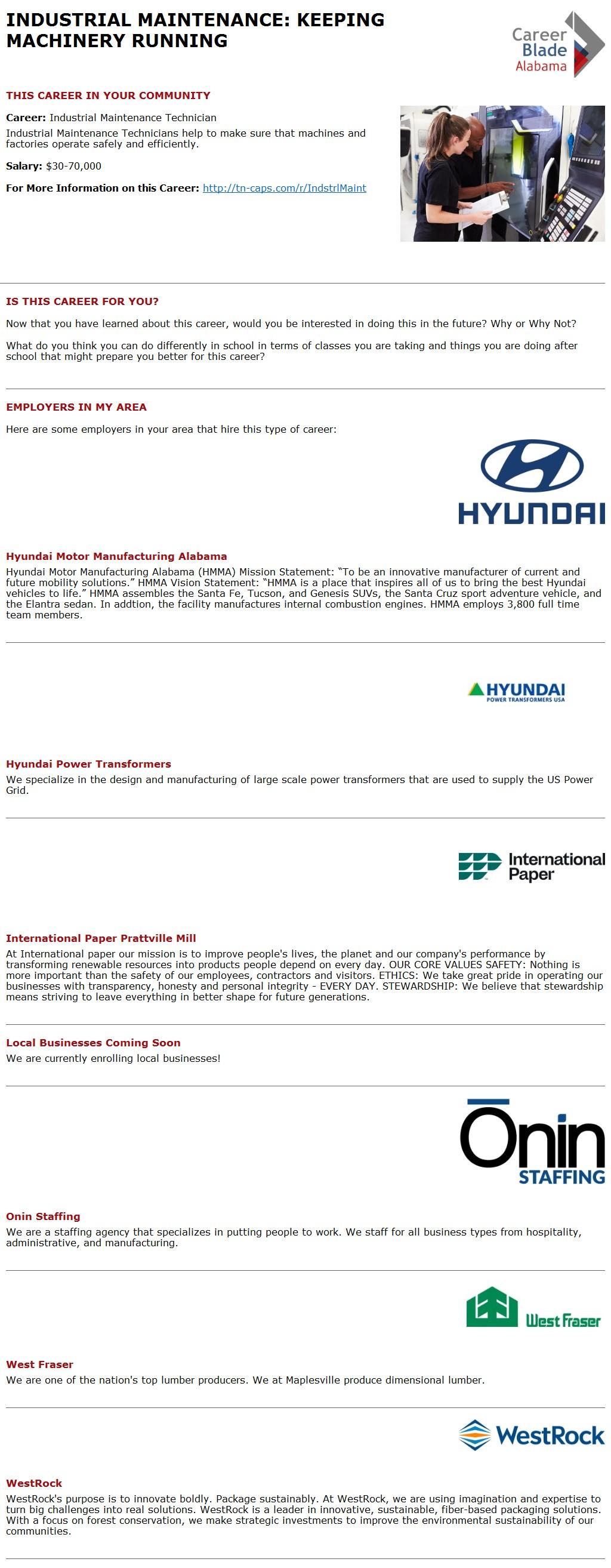 Class Message: Today we are going to explore some of the responsibilities and duties of an Industrial Machinery Mechanic, which is a career within the Manufacturing industry. An Industrial Machinery Mechanic’s job is to ensure that all equipment, tools, and machinery are properly calibrated and maintained to prevent shutdowns and meet production goals.