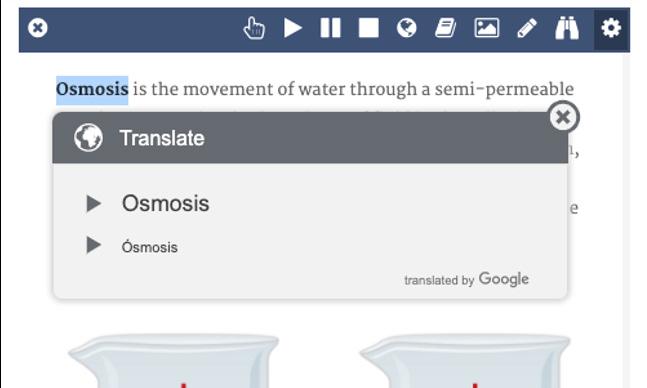 Selected words or phrases can be translated and/or read aloud in 60+ languages, providing continuous learning supports for English Language Learners.