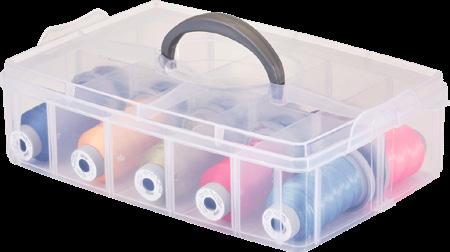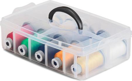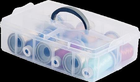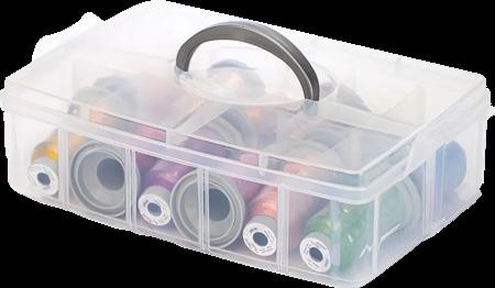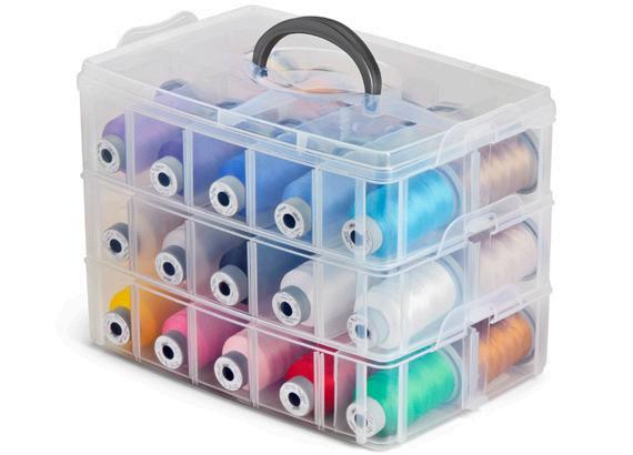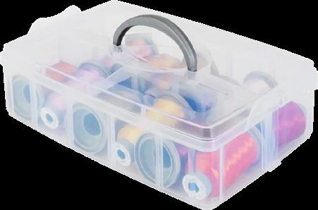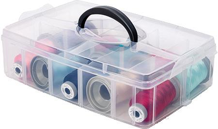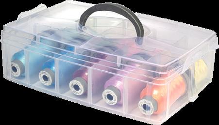 Create your own thread kit! Layers can be vertically-stacked for increased storage. One layer holds (10) 1,100 yd 40 wt Mini Glide thread spools. Size with lid & layer: 9-3/4” x 6-1/2” x 2-3/4”