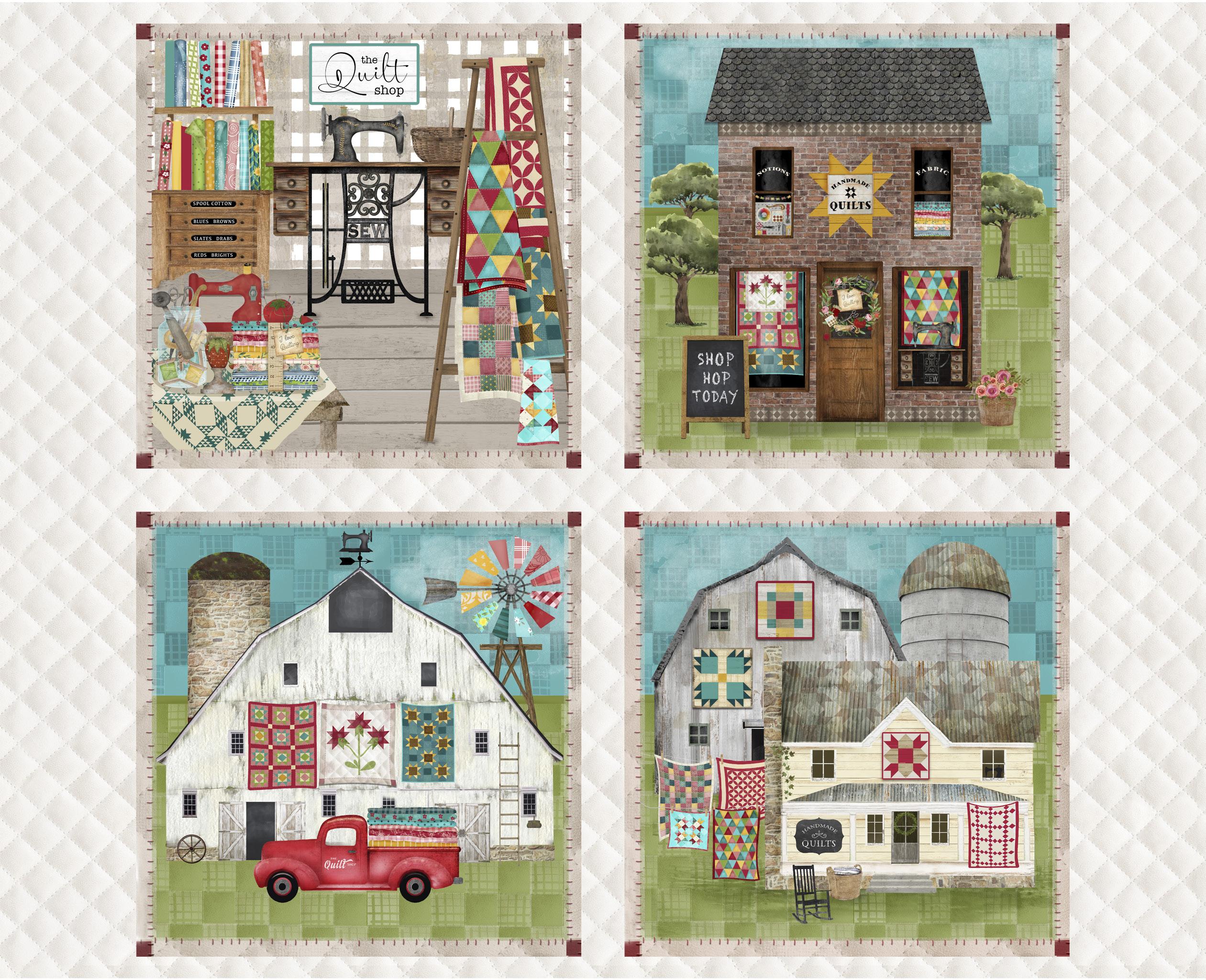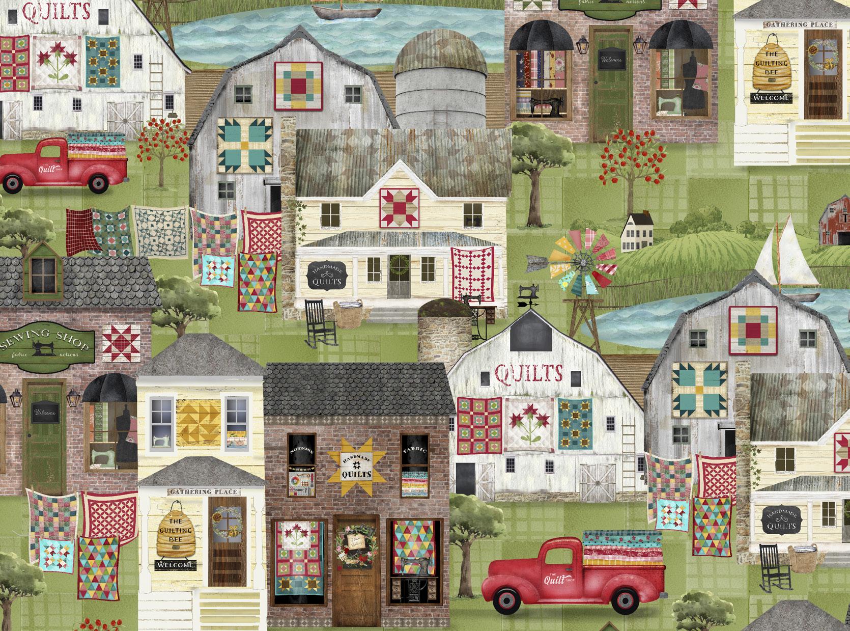 Finished Quilt Size: 68 ½ in x 88 ½ in (173.99 cm x 224.79 cm) 21701-PNL-CTN-D (Shop Hop Panel) 1 yard 1 Bolt 21695-MLT-CTN-D (Perfect Squares)* 1 ½ yards 2 Bolts 21698-GRN-CTN-D (Around the Town) 1 ½ yards 2 Bolts 21700-CRM-CTN-D (Tossed Notions) 1 1/8 yards 1 Bolt 21697-TEA-CTN-D (Whirling Windmill) 1 yard 1 Bolt 21696-CRM-CTN-D (Vintage Machines) 7/8 yard 1 Bolt 21699-MLT-CTN-D (Keepsake Patch) 5/8 yard 1 Bolt 21698-GRN-CTN-D (Around the Town) for Backing 5 ½ yards 5 bolts