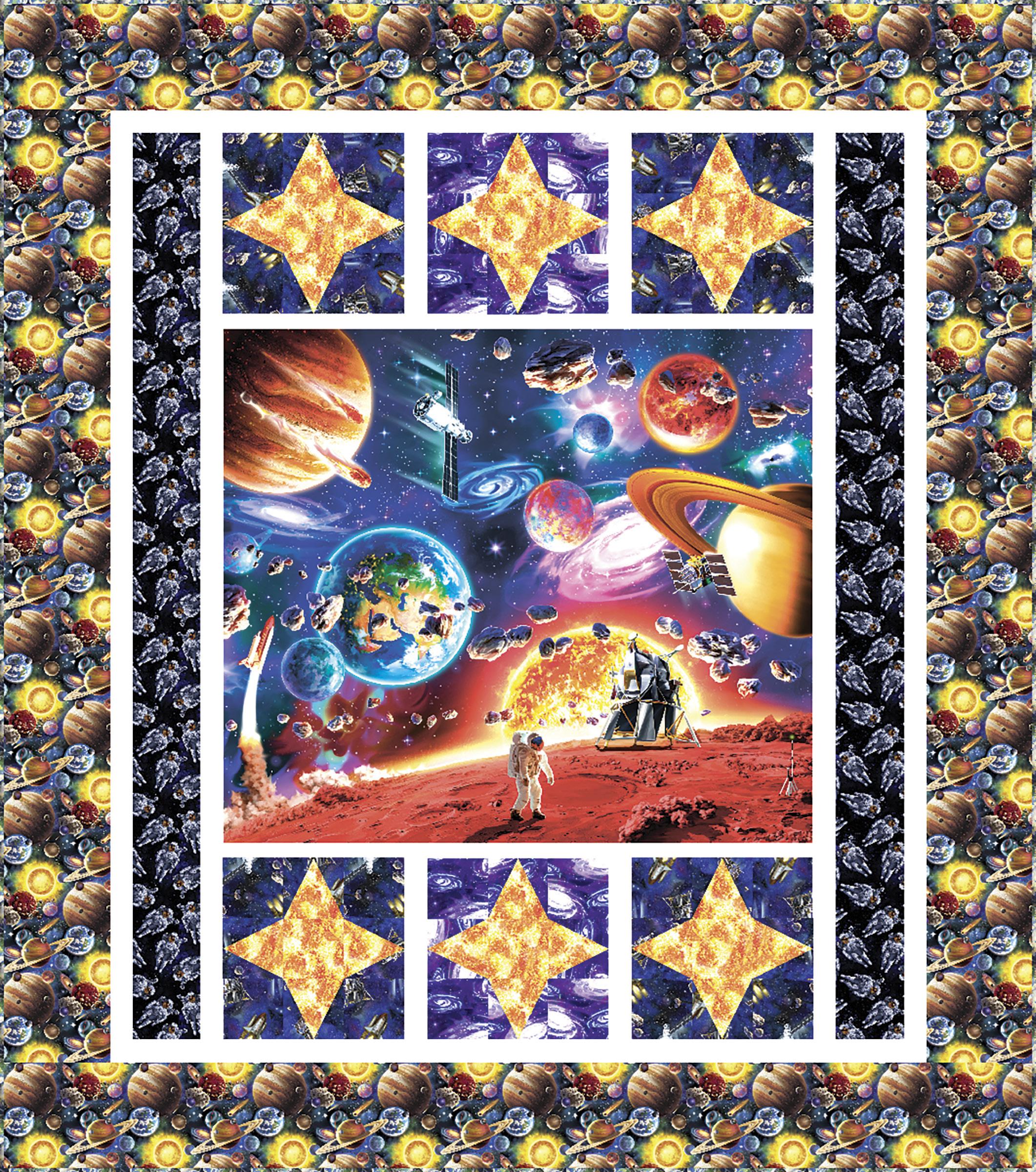 Finished Quilt Size: 68 ½ in x 78 ½ in (173.99 cm x 199.39 cm) 21510-PNL-CTN-D (Final Frontier Panel) 1 yard 1 Bolt 21507-MLT-CTN-D (Solar System) 1 7/8 yards 2 Bolts 21504-BLK-CTN-D (Floating Astronauts) 1 ¾ yards 2 Bolts Solid White Cotton 1 yard 1 Bolt 21509-MLT-CTN-D (Packed Planets)* 2/3 yard 1 Bolt 21506-BLU-CTN-D (Dodging Satellites) 5/8 yard 1 Bolt 21505-YLW-CTN-D (Blazing Suns) ½ yard 1 Bolt