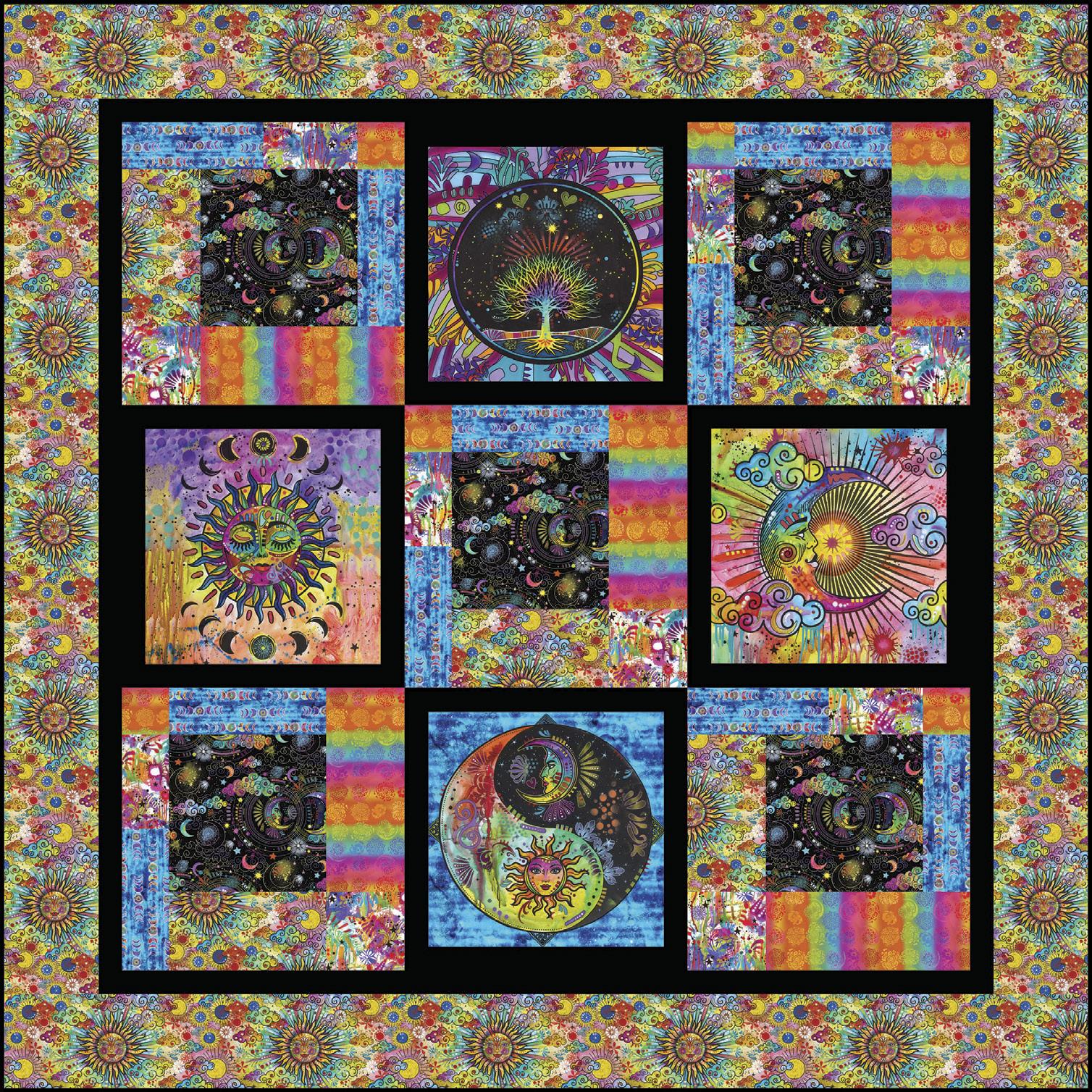 Finished Quilt Size: 69 ½ in x 69 ½ in (176.53 cm x 176.53 cm) 21642-PNL-CTN-D (Stargazer Panel) 1 yard 1 Bolt 21641-MLT-CTN-D (Rising Sun) 1 ¾ yards 2 Bolts Solid Black Cotton* 1 ½ yards 2 Bolts 21637-BLK-CTN-D (Dark Side of the Moon) ¾ yard 1 Bolt 21639-MLT-CTN-D (Flower Child) ½ yard 1 Bolt 21640-BLU-CTN-D (Moon Phases) 3/8 yard 1 Bolt 21638-MLT-CTN-D (Bold Splash) 1/3 yard 1 Bolt 21638-MLT-CTN-D (Bold Splash) for Backing 4 ½ yards 4 Bolts