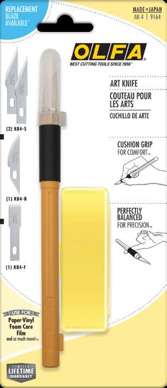 Designed with a comfort grip and anti-roll device, the OLFA Art Knife comes with 3 types of blades: Precision, Chisel, and Curved Carving blade.