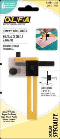 Easily create perfect circles up to 6” diameter with the Compass Circle Cutter. The pivot-point slide quickly adjusts to change diameters. Simply place the pivot-point in place and rotate. The ultra- sharp fixed blade cuts a perfect circle. For use with paper, films, cardboard, and light wood. Includes 6 COB-1 blades.