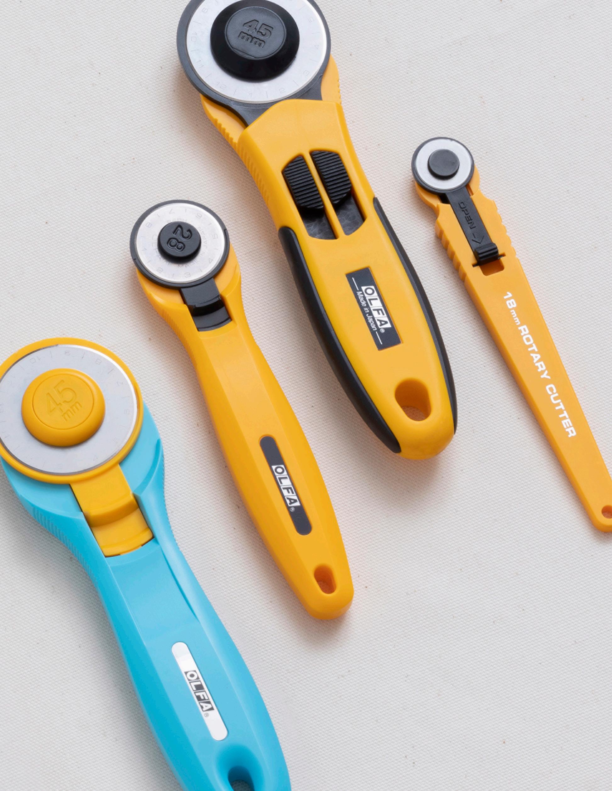 OLFA self-healing rotary cutting mats should always be used to avoid damage to your work surface, and extend your blade life. The RTY-2/CYEL (45mm) uses OLFA 45mm replacement blades, which cut up to 8 layers of cotton fabric.