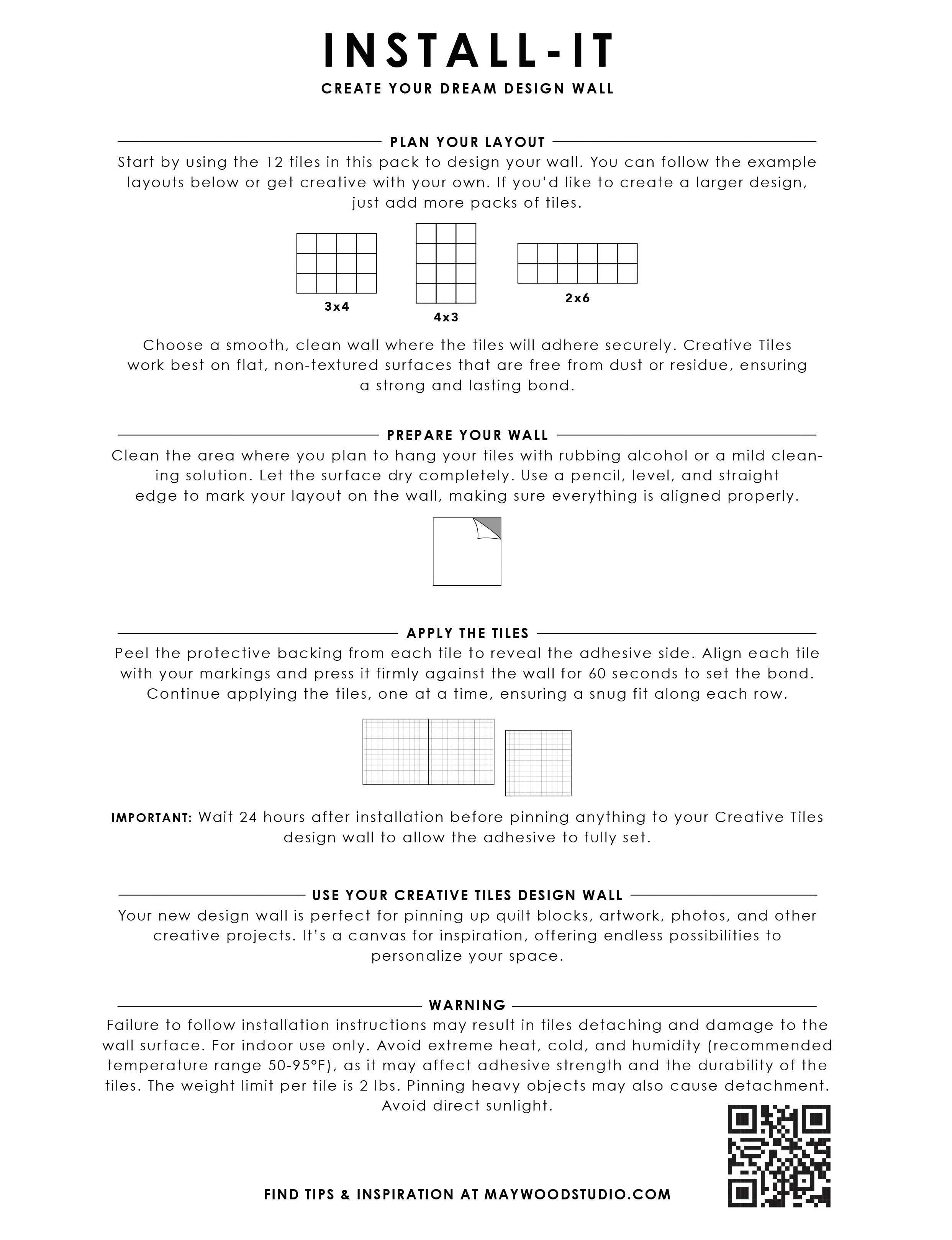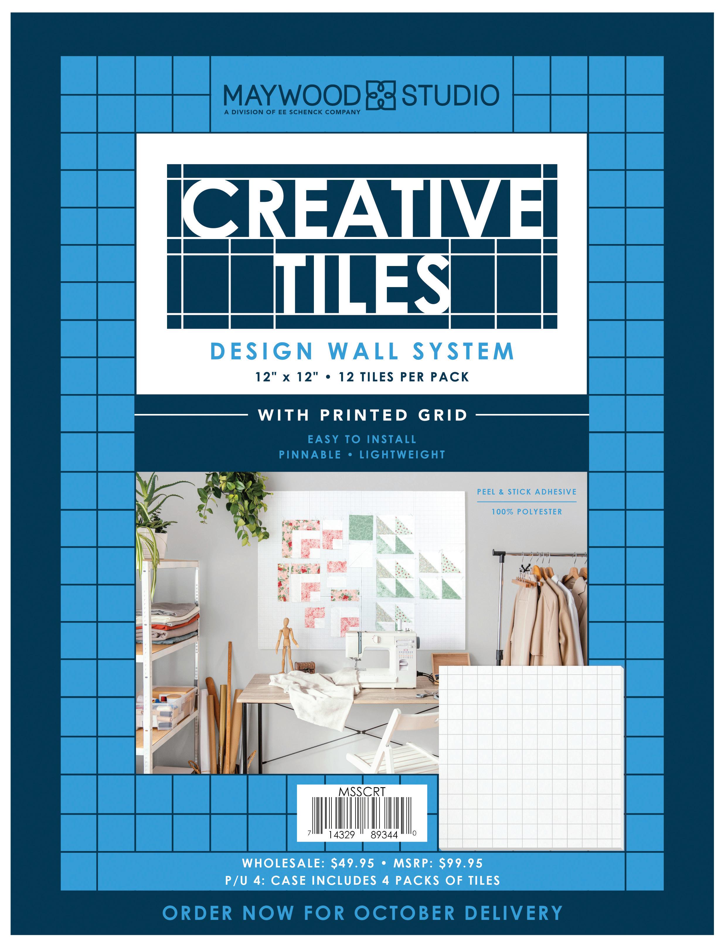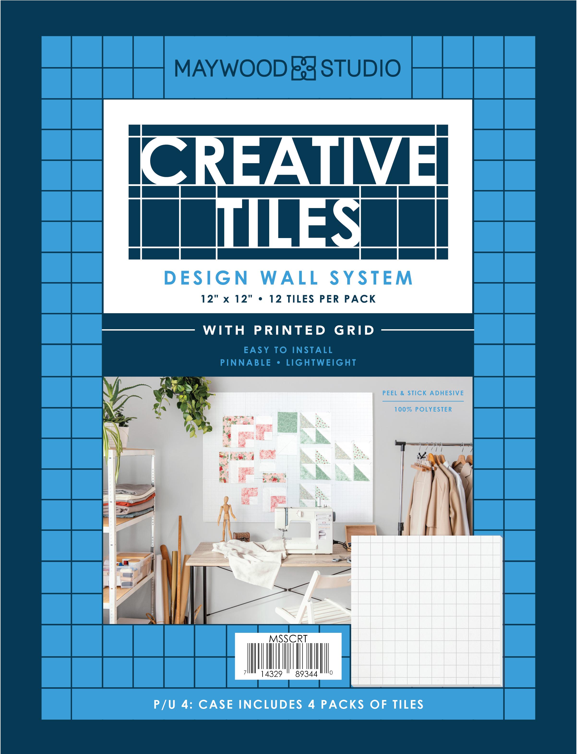 Maywood Studio Creative Tiles Design Wall System includes twelve 12” x 12” tiles per pack, creating a 3’ x 4’ design area right out of the box. Lightweight and easy to install, each tile features a printed 1” grid for precise layout and easy pinning. The modular system makes it easy to expand your wall by adding more tiles, allowing you to customize it for any space.