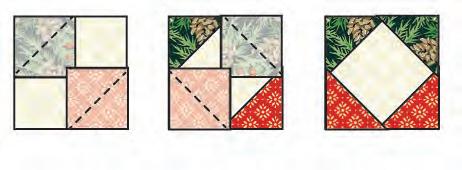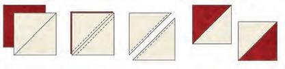 1. Mark a diagonal line from corner to corner on the F3-B squares. Place the F3-B squares on opposite sides of the F1-A square. Sew on the marked line. Trim 1/4" away from the stitching. Press away from center. Make 6.
