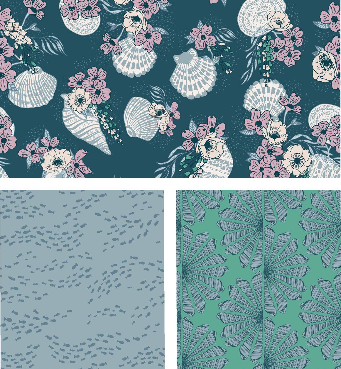 The secrets and stories of the sea are revealed through shells. Each pattern in this collection celebrates the magic, mystery, and music of the ocean. From lyrical synchronized formations to organic sea-inspired bouquets, each piece brings molodious textures and calming sentiments.