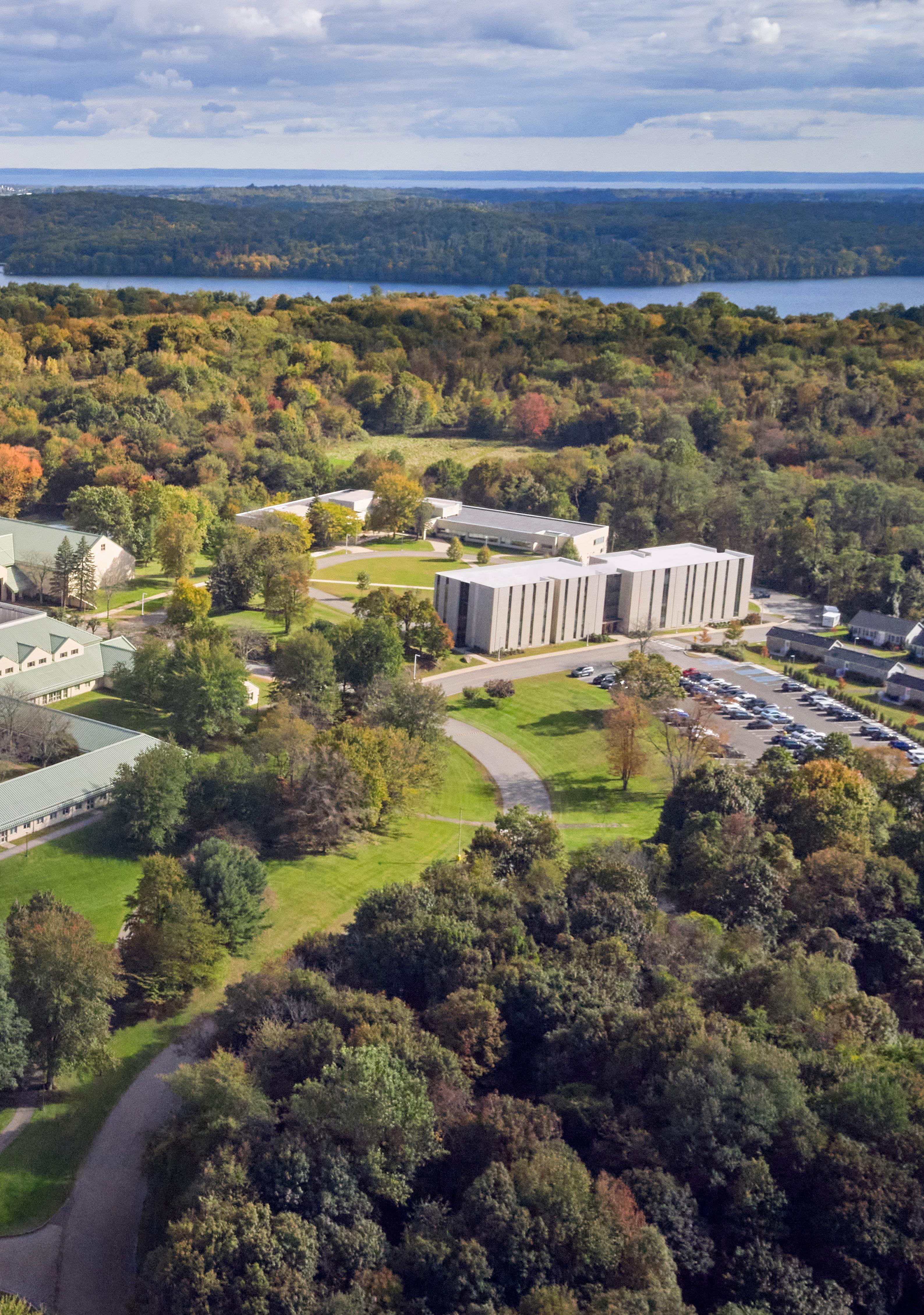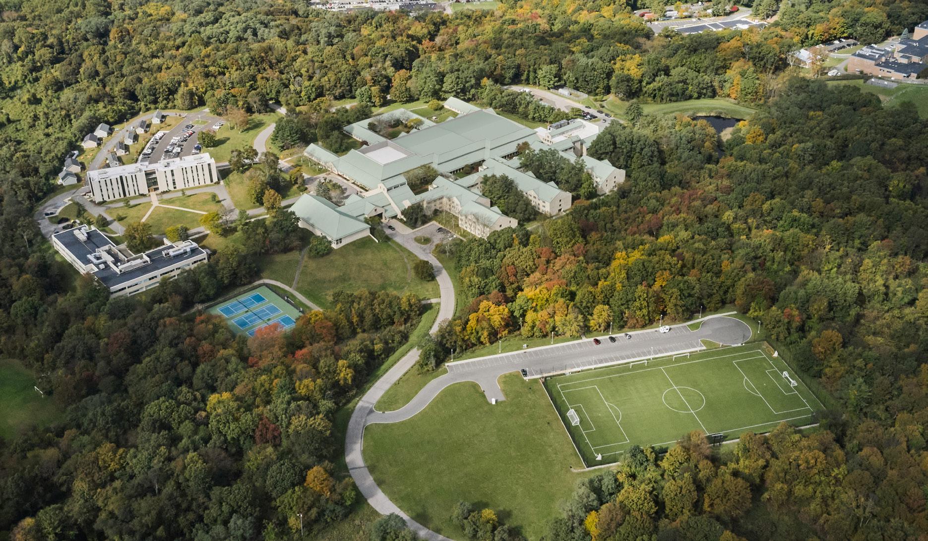 Surrounded by 97 acres of wooded grounds, our campus in New York is tucked away in the quiet suburban town of Thornwood. In warmer months, the grassy quad is where you can read, play frisbee, and listen to music with your friends. The courtyard between the East and West Halls hosts residence activities, outdoor study sessions, and badminton matches. When it snows, our forest turns into a true winter wonderland. Running and biking trails weave through the wooded grounds throughout campus, and wildlife, including deer and turkeys, frequently roam the grounds.